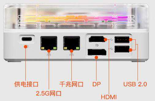它的背部配置了Type-C电源口,2个千兆RJ45网口,1个标准HDMI和标准DP,2个接口。因此这款机器虽然设计小巧,但接口扩展性没得说,各类常用接口配置齐全,方便用户使用。