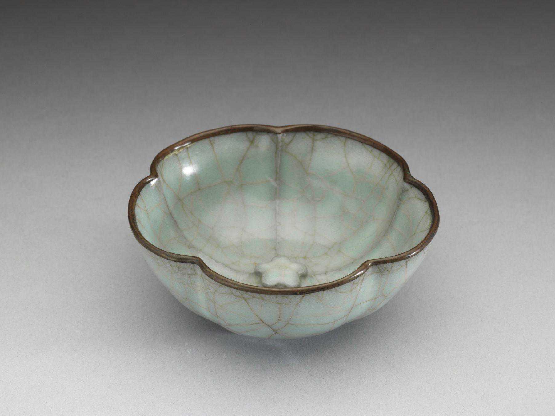 五瓣花口盏,口沿嵌铜扣。弧形深壁,胎质坚薄,内周壁依随五花口突起五道稜脊,与之对应的外周壁则出现凹陷的浅沟。内底心贴饰梅花一朵,矮圈足。