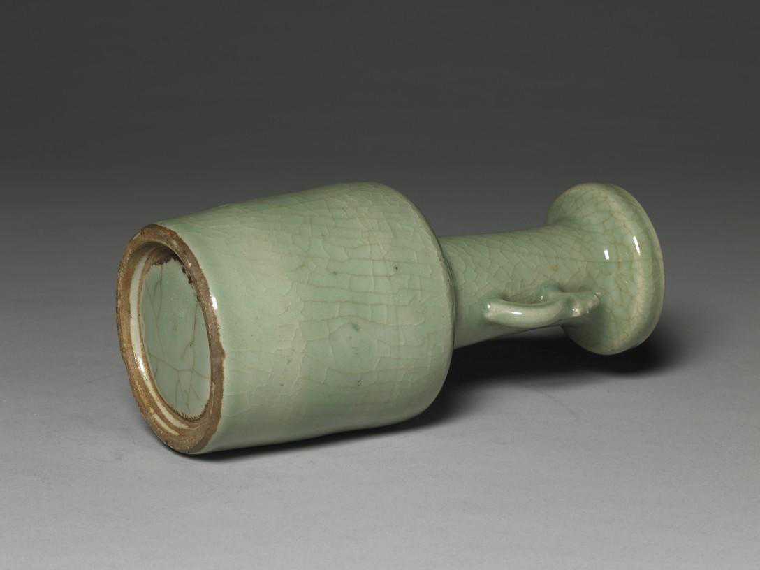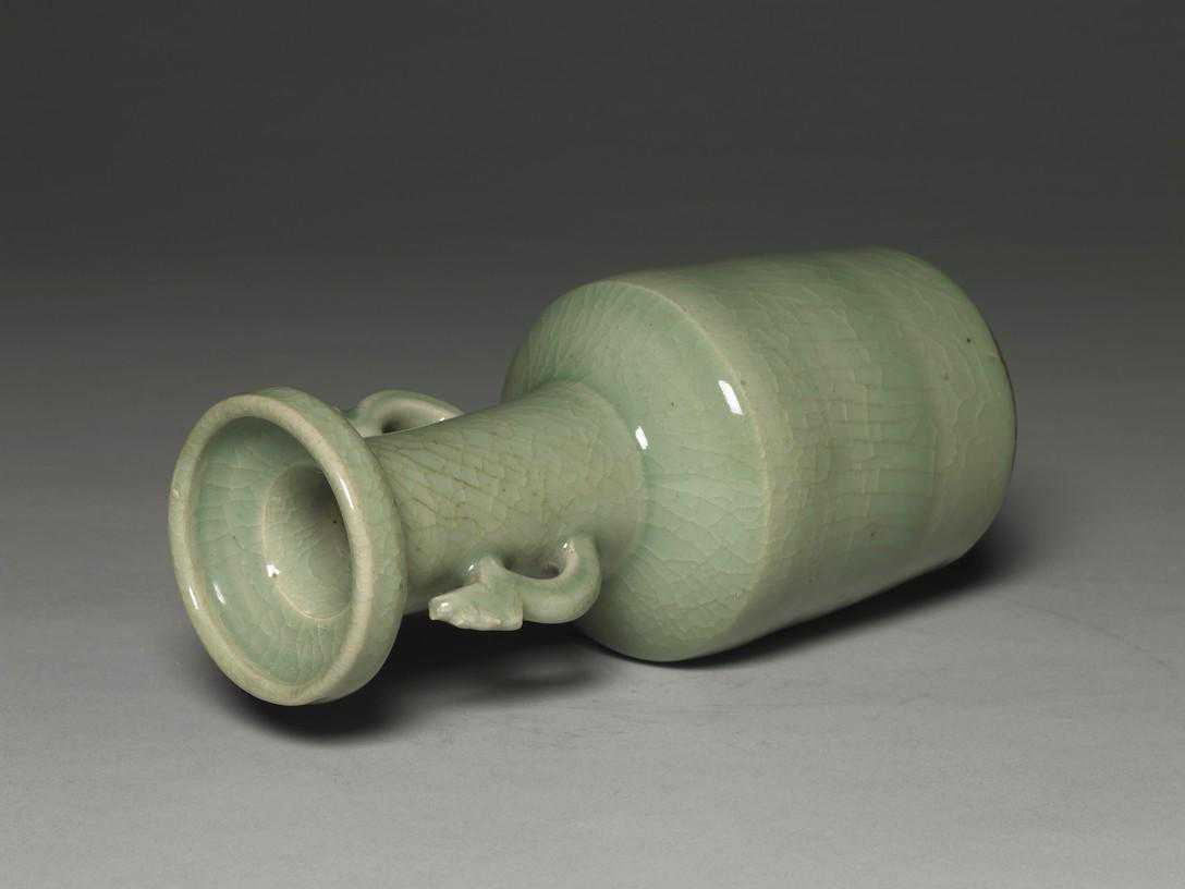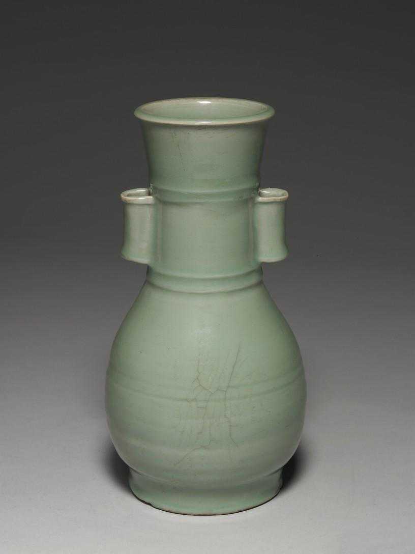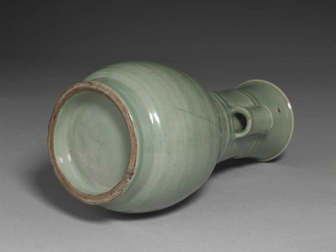 纸捶瓶是宋代常见的瓶形,而颈的两侧作兽耳,则是龙泉窑所特有,且制作数量多,工法粗细不一,疑其年代或有晚至明中叶者。