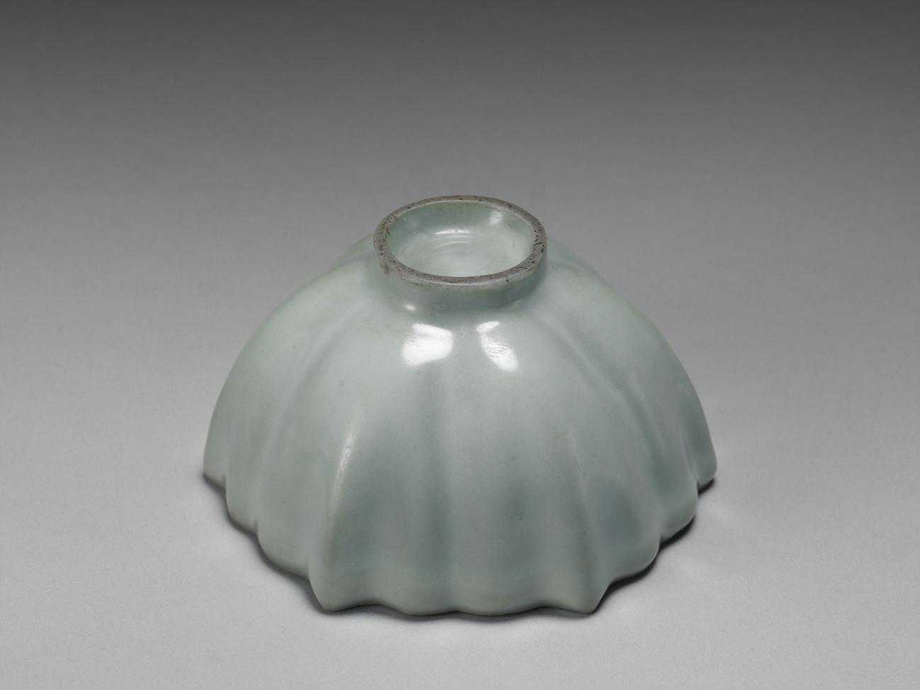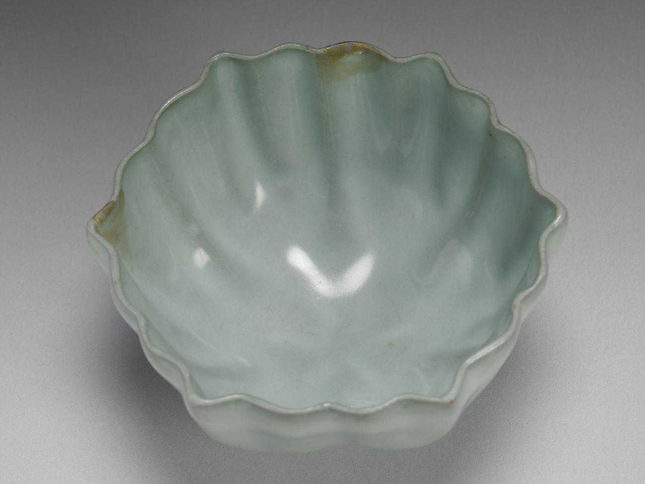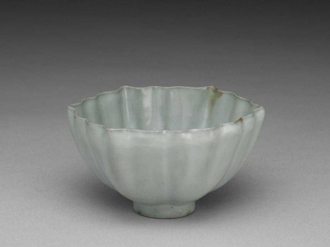 碗,六瓣菱花形,侈口,深壁,尖底,矮圈足。胎质坚薄,全器施青釉,釉色微灰。碗壁有稜,稜現白骨,圈足端露灰色胎。