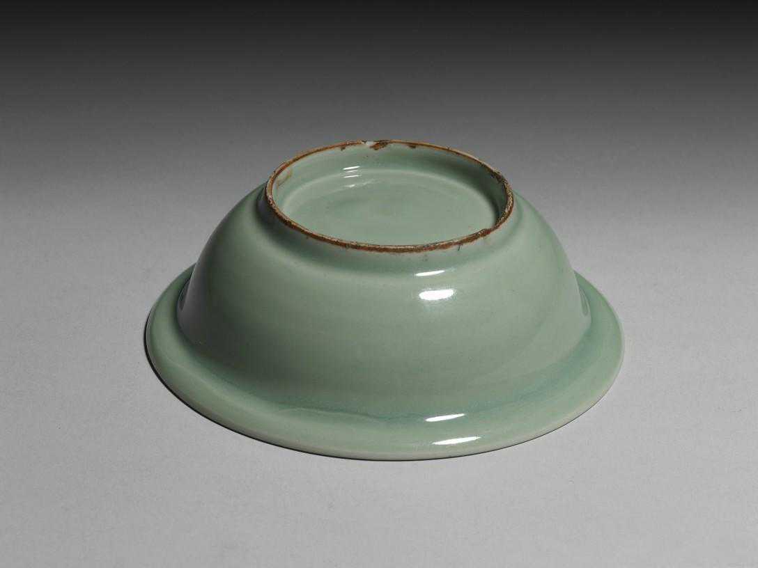 足缘窄细,足端平切露胎,呈色灰褐。此为龙泉窑常见的器形与纹饰,数量众多,海外各遗址均有所见。