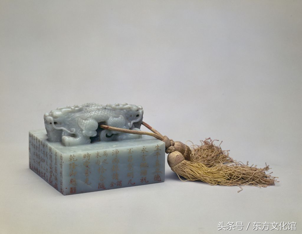 “十全老人之宝”,清乾隆,碧玉质,交龙纽方形玺,汉文篆书。面12.8cm见方,通高15.3cm,纽高5.4cm。