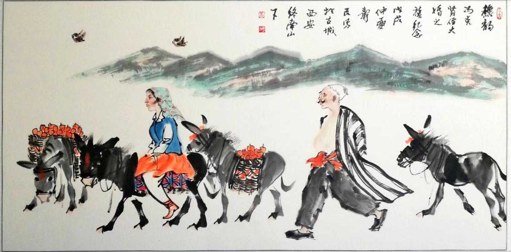 寿民画的驴儿,形体矫健,四蹄轻捷,气韵天成,很有灵气,也很有动感,似乎能听到“得得得”的蹄声从画里传出,把驴儿刻画得惟妙惟俏、入木三分、活灵活现。2018年儿子结婚,寿民画了一幅《秋韵》,画中,远山如黛,一个年轻漂亮的维吾尔族媳妇骑着一头驴儿,丈夫在后面大步流星地走着,两头驴儿各驮着一筐石榴,一头小驴儿悠闲地跟着,像是带着丰收的果实和喜悦回娘家。这幅画中的驴儿画得很好。可以这样说,寿民画的驴儿,比真的好看,比真的金贵!