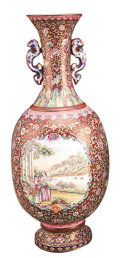 清代广州画珐琅缠枝花卉山水人物纹双耳瓶