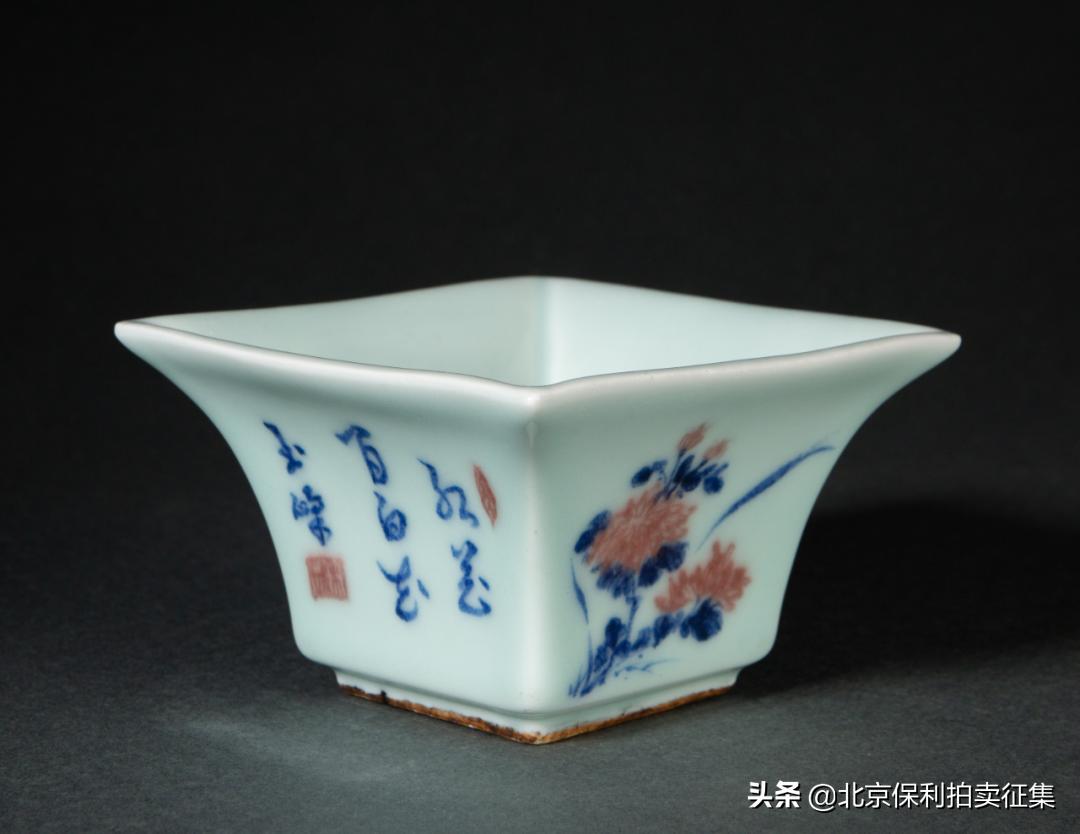 清乾隆青釉地青花釉里红花卉诗文四方斗杯