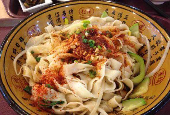 王世阁:我要介绍一款因为名字复杂而被很多人错过的陕西经典面食——biángbiáng面!关于biángbiáng面的起源,民间有很多种说法,这些说法大多是模拟声音而定字音:面在制作的擀制和拉扯过程中在案板上会发出biángbiáng的声音;在捞出和调味搅拌过程中,发出biángbiáng的声音;面在入口时,嘴边会发出biángbiáng的声音等等。关于biáng这个字的写法,看似非常复杂,其实也有一个十分有趣的童谣:“一点飞上天,黄河两道弯,八字大张口,言字往里走,左一扭,右一扭,你一长,我一长,当中夹个马大王,心作底,月作帮,揳个钉钉挂麻糖,推上车车逛咸阳。”biángbiáng面的特点是宽,像裤腰带一样宽,只有一条,你可以呲溜呲溜,吃着吃着就没有办法停下嘴。著名的“陕西八大怪”中“面条像裤带”就是指biángbiáng面。