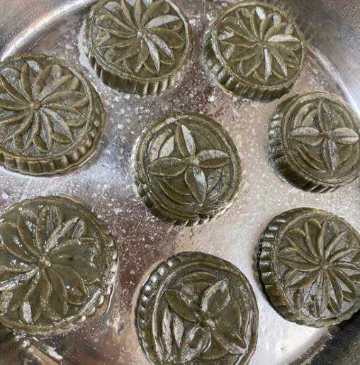 李芳芳:鸡屎藤饼,听名字很恐怖,但是吃起来却有一股奇特的清香。它是用一种叫做鸡屎藤,又名乌芹藤的植物做的,《纲目拾遗》云:“搓其叶嗅之,有臭气未知其正名何物,人因其臭,故名臭藤。”同样作为清明节的小吃,比艾叶饼的颜色要深,具有祛湿、消食的作用。