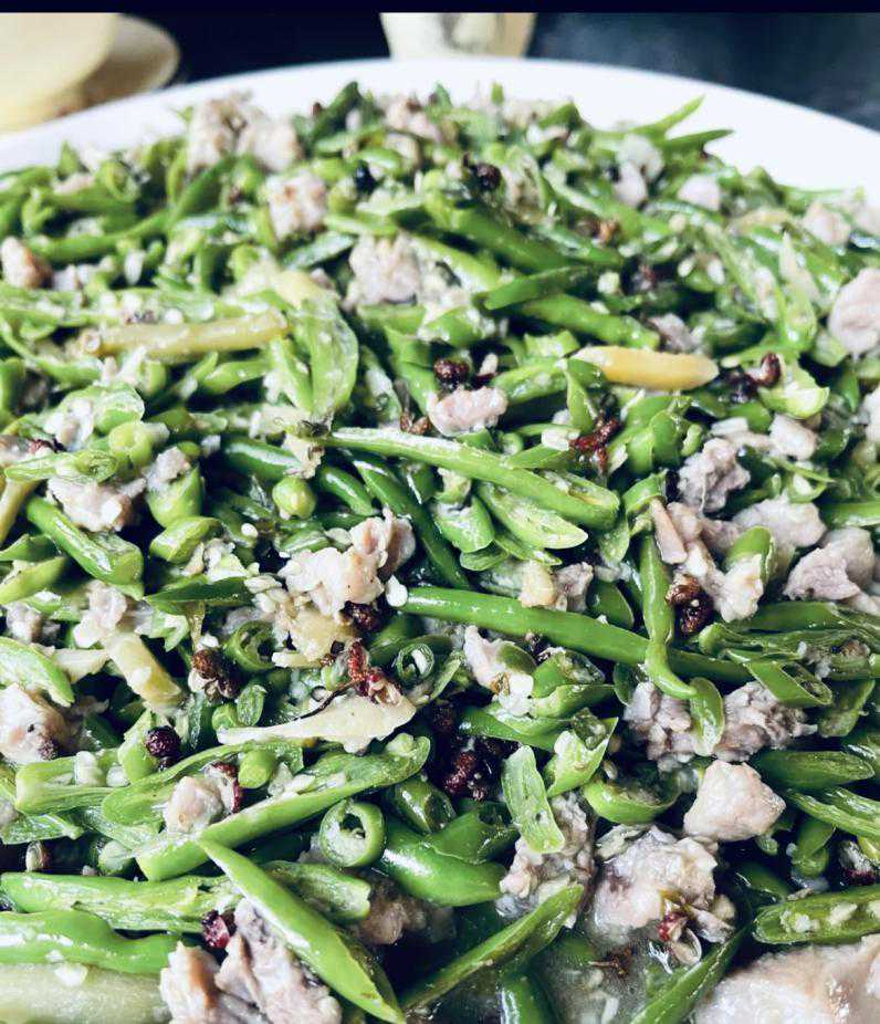 肖正阳:“苍蝇头”其实就是豆角、蒜苔和肉丁组成的小炒。关于这“苍蝇头”的来历,据说还有个有趣的小故事。它本是台北餐厅很常见的一道小炒,但有一天老板听客人讲,怎么菜里好像有很多苍蝇头,就被启发说干脆给菜起名叫“苍蝇头”好了。一个小误会成就了一道怪菜,而当时让客人混淆成苍蝇头的“罪魁祸首”,就是这道菜里的豆豉了。
