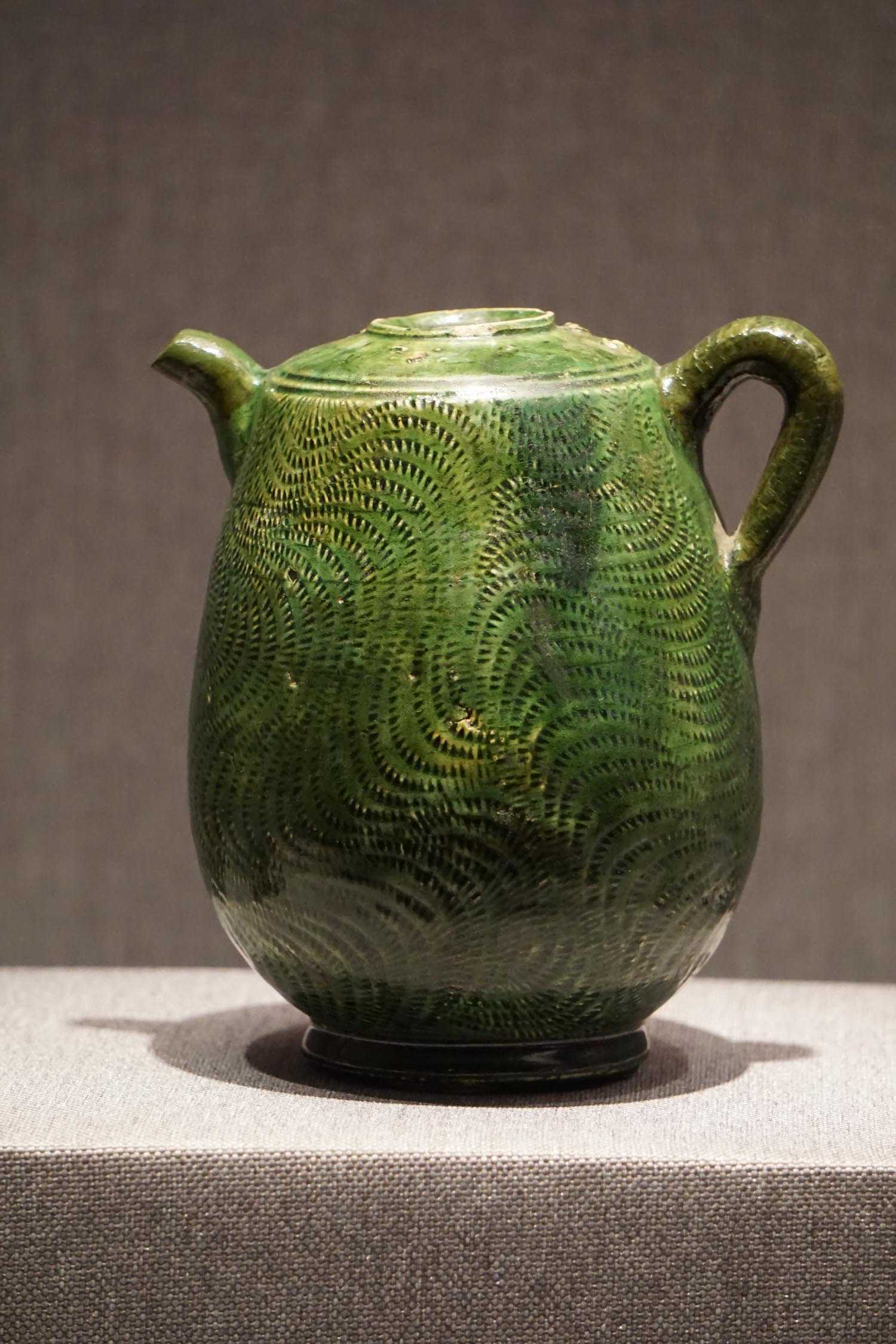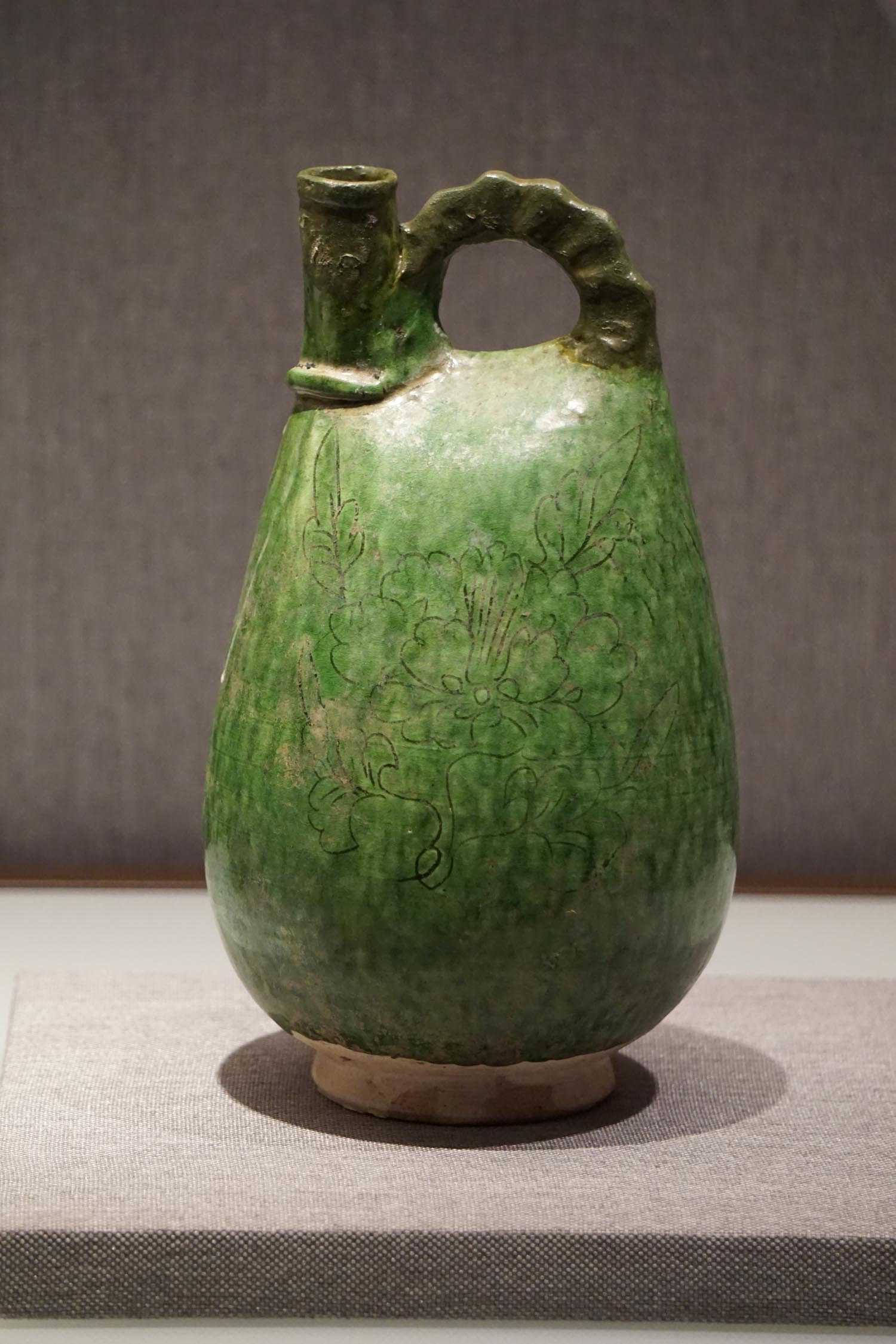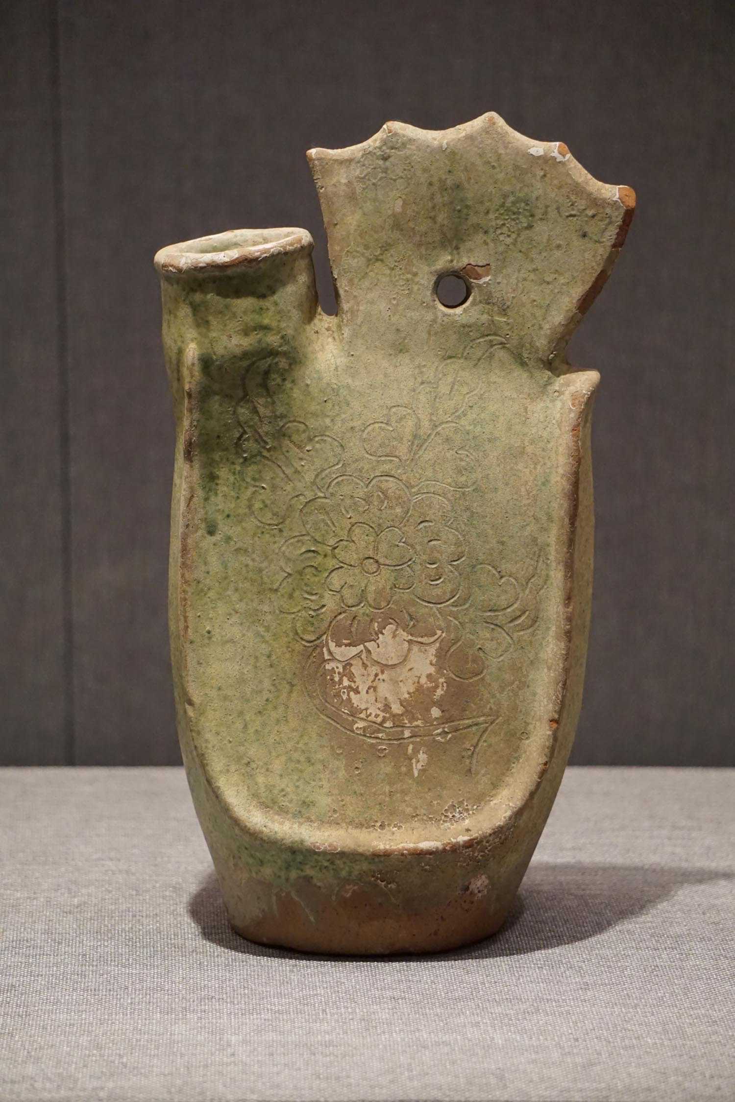 绿釉划牡丹纹捏梁鸡冠壶辽