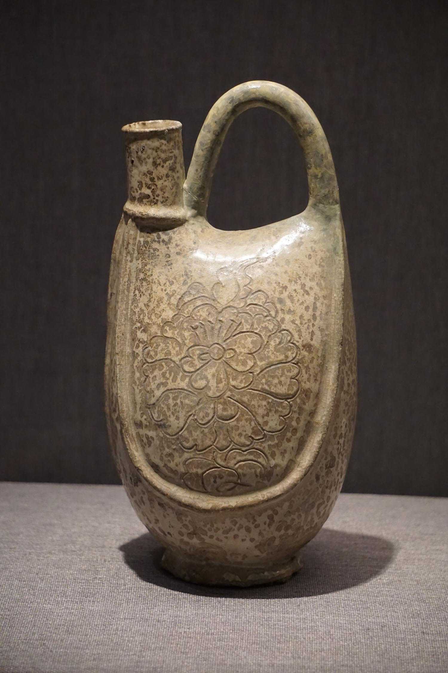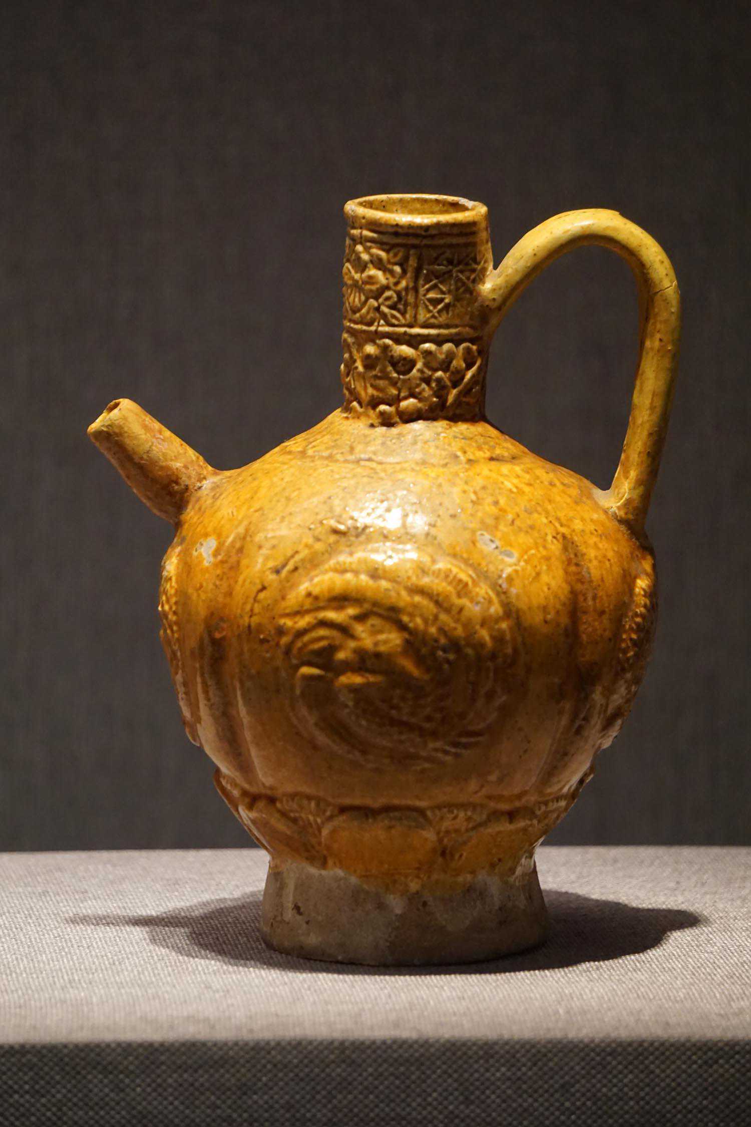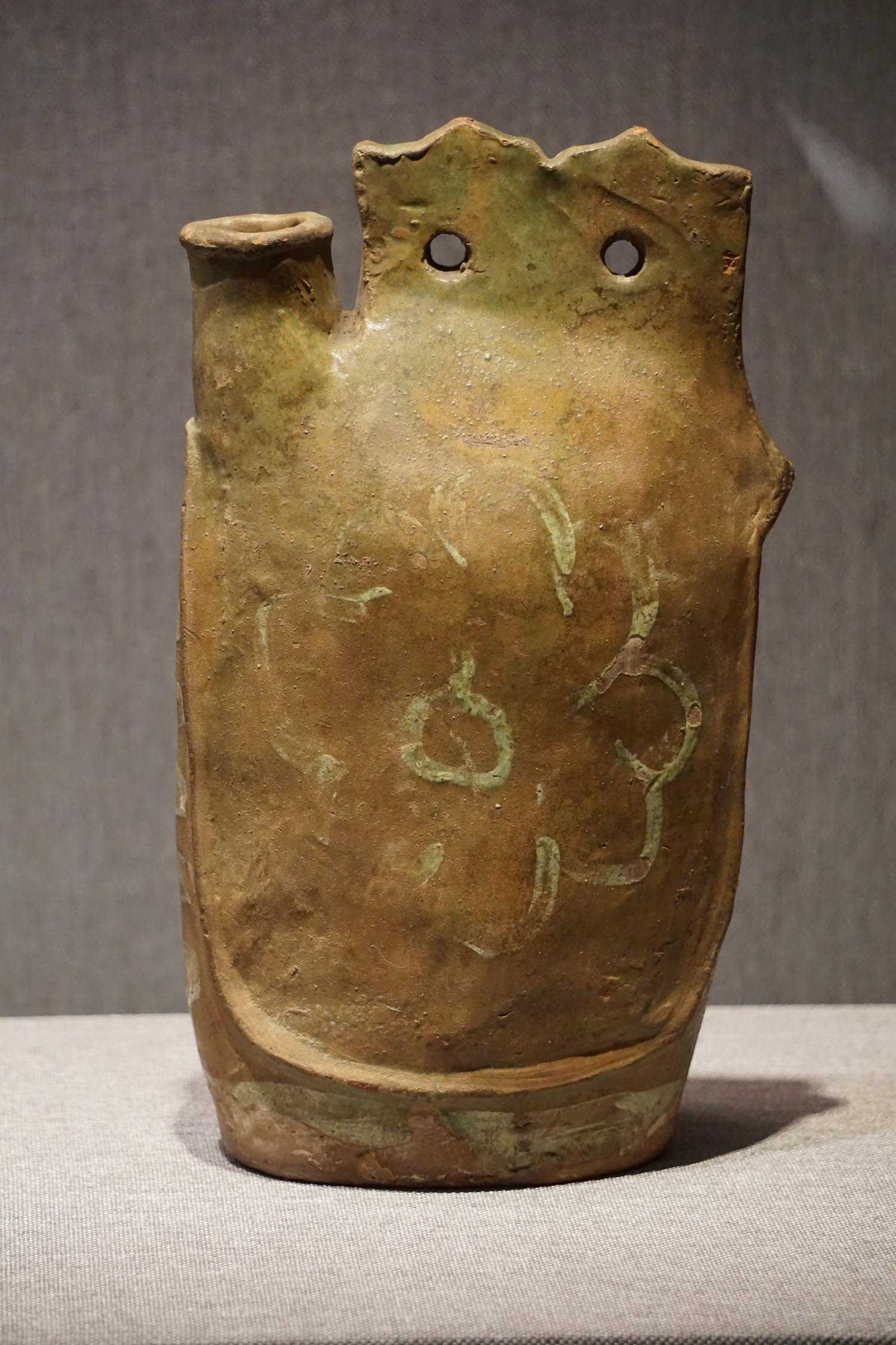 鳝鱼黄釉雕几何纹穿带扁壶辽