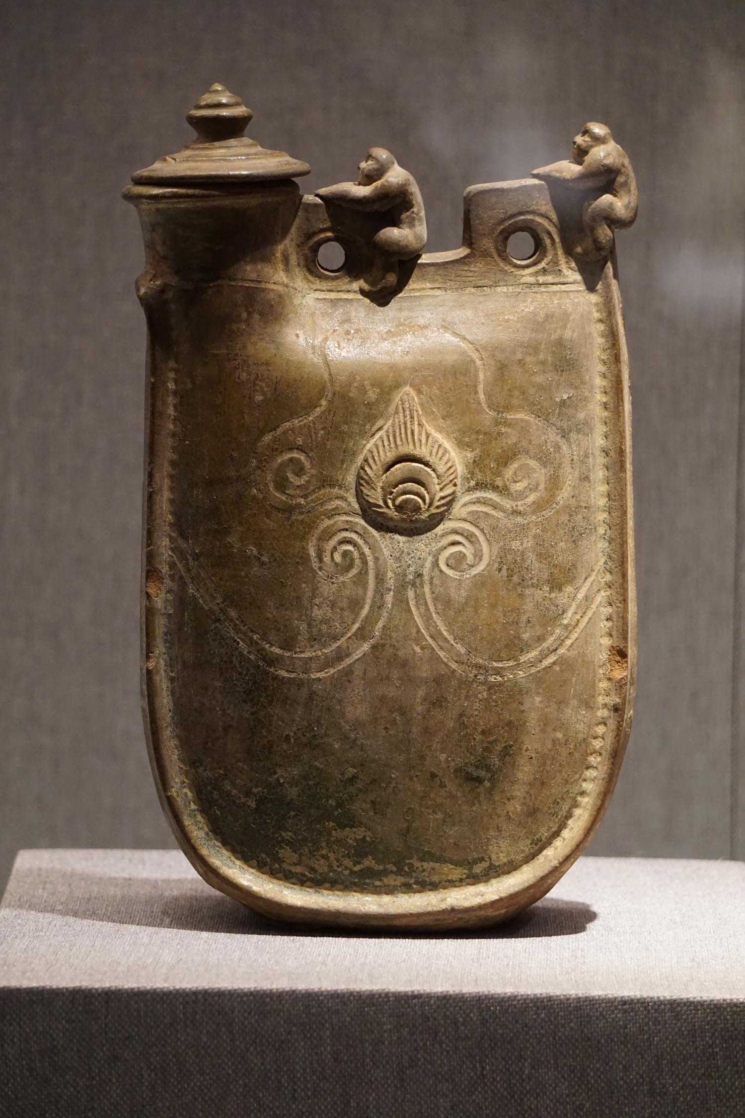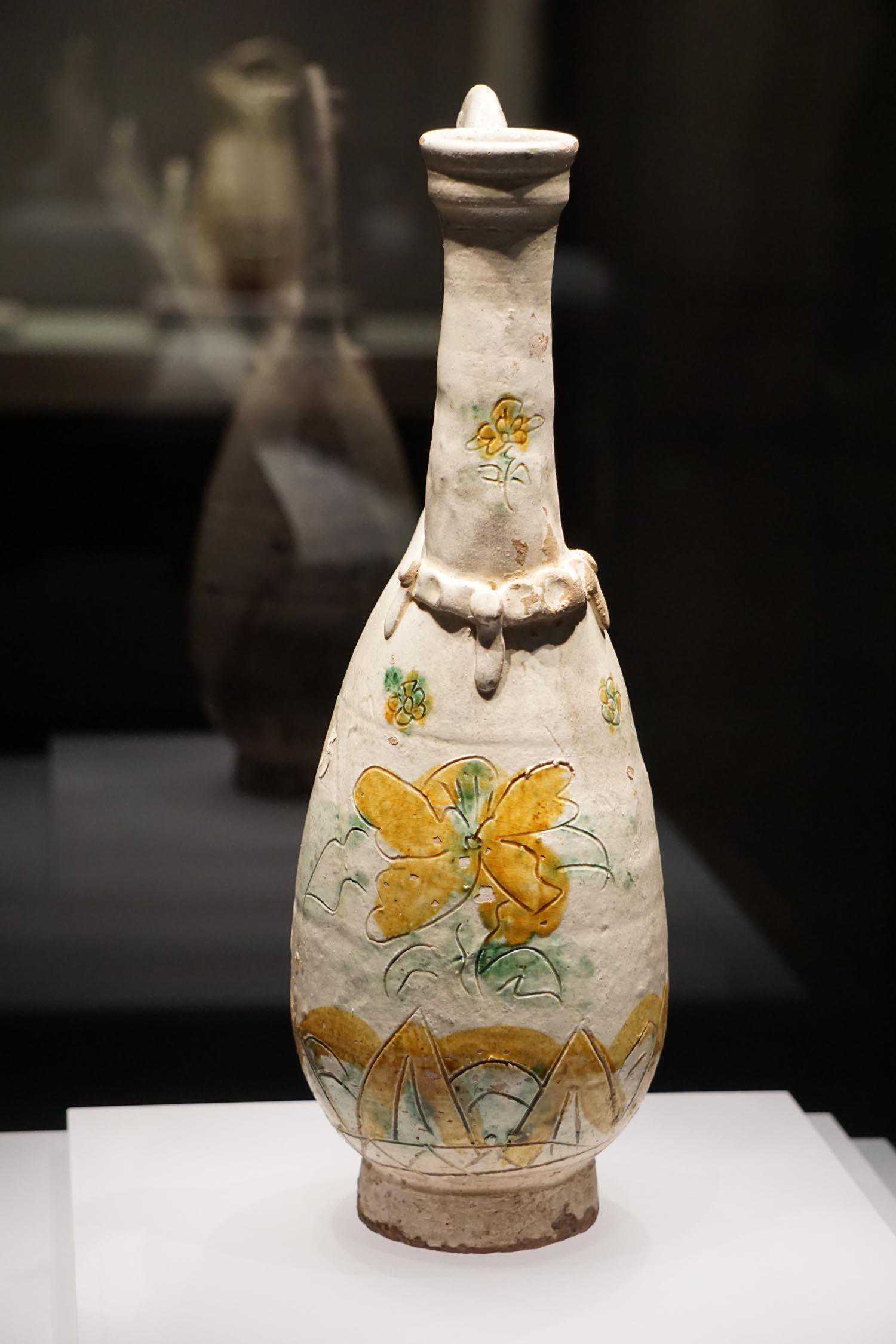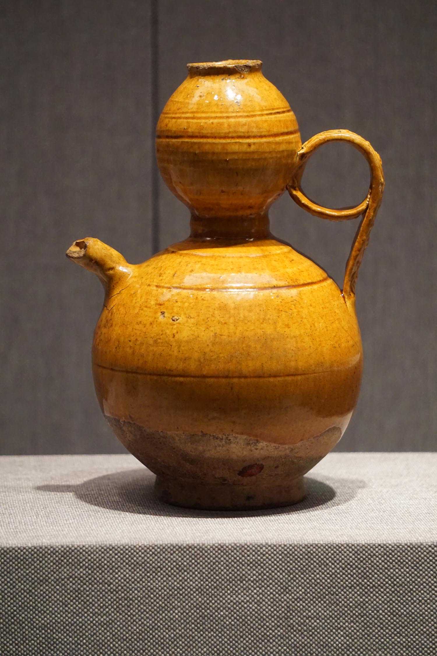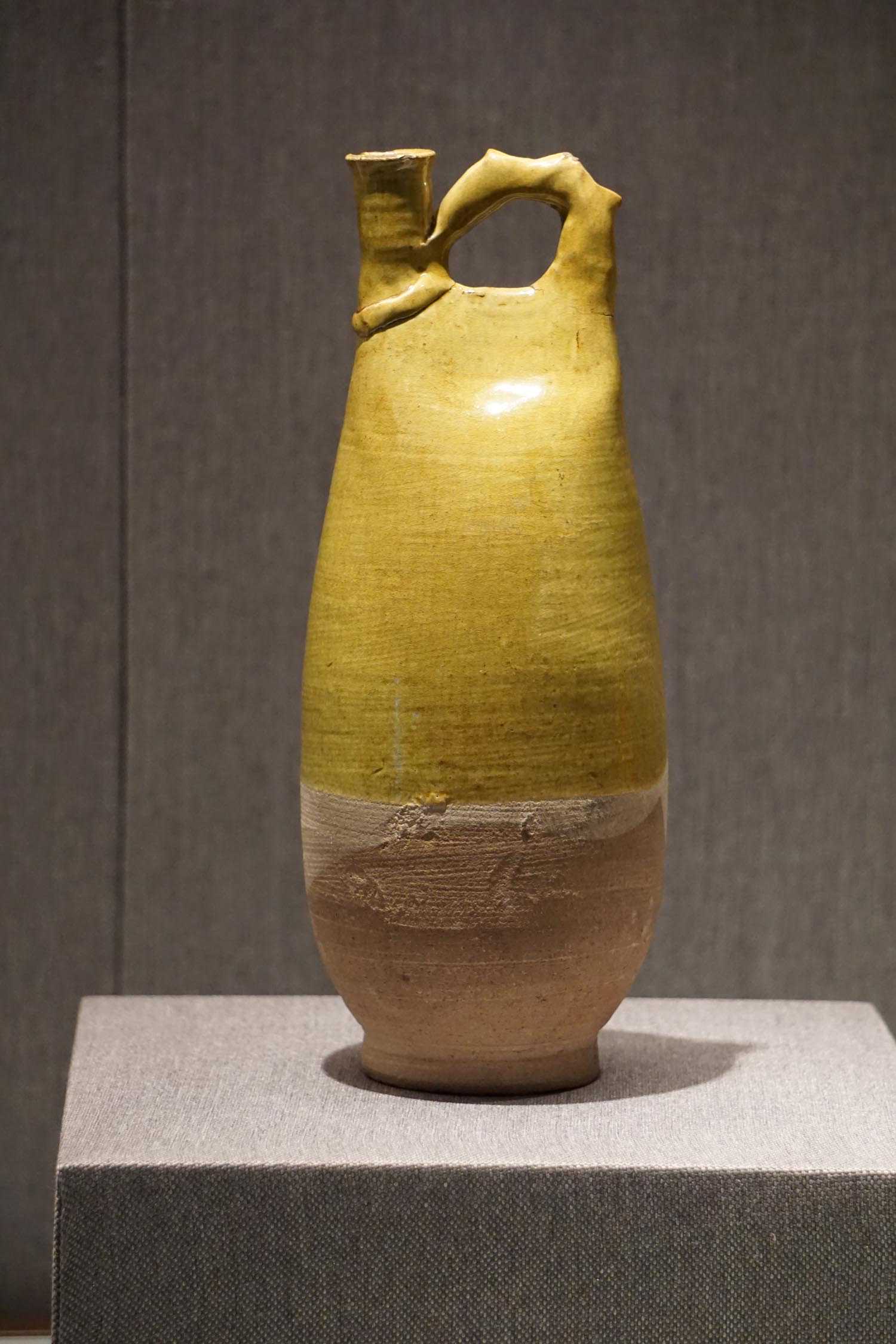 鳝鱼黄釉雕几何纹穿带扁壶辽