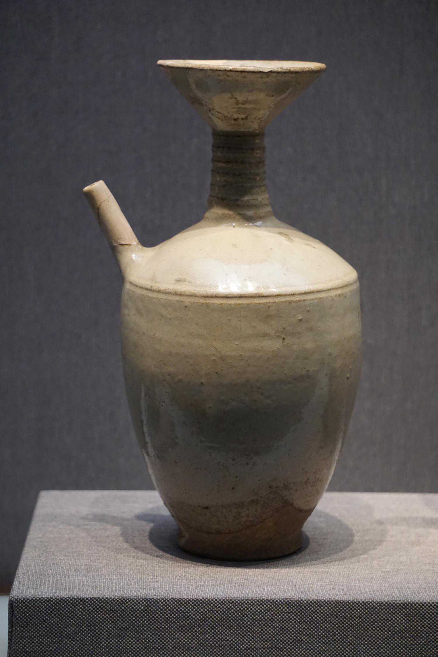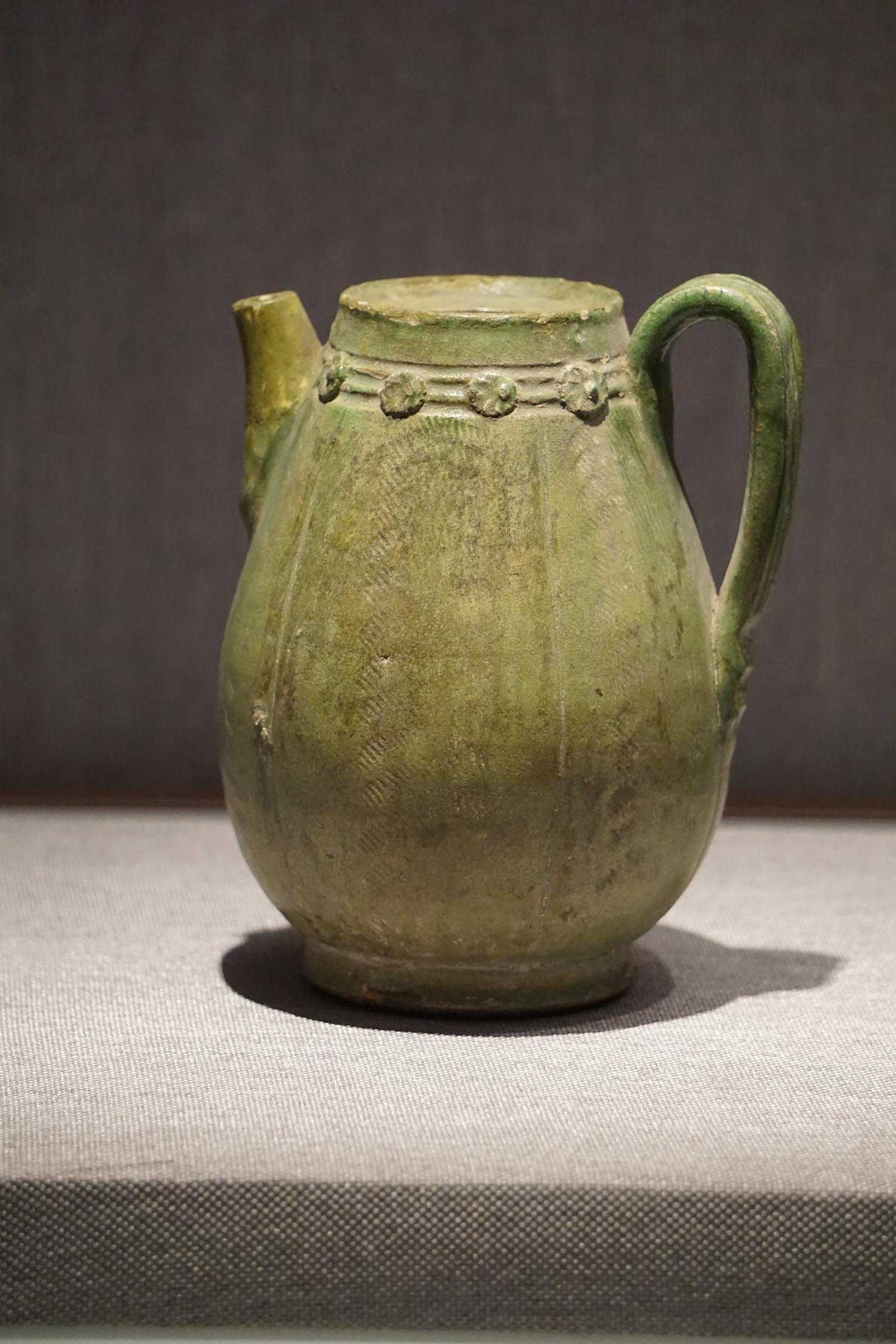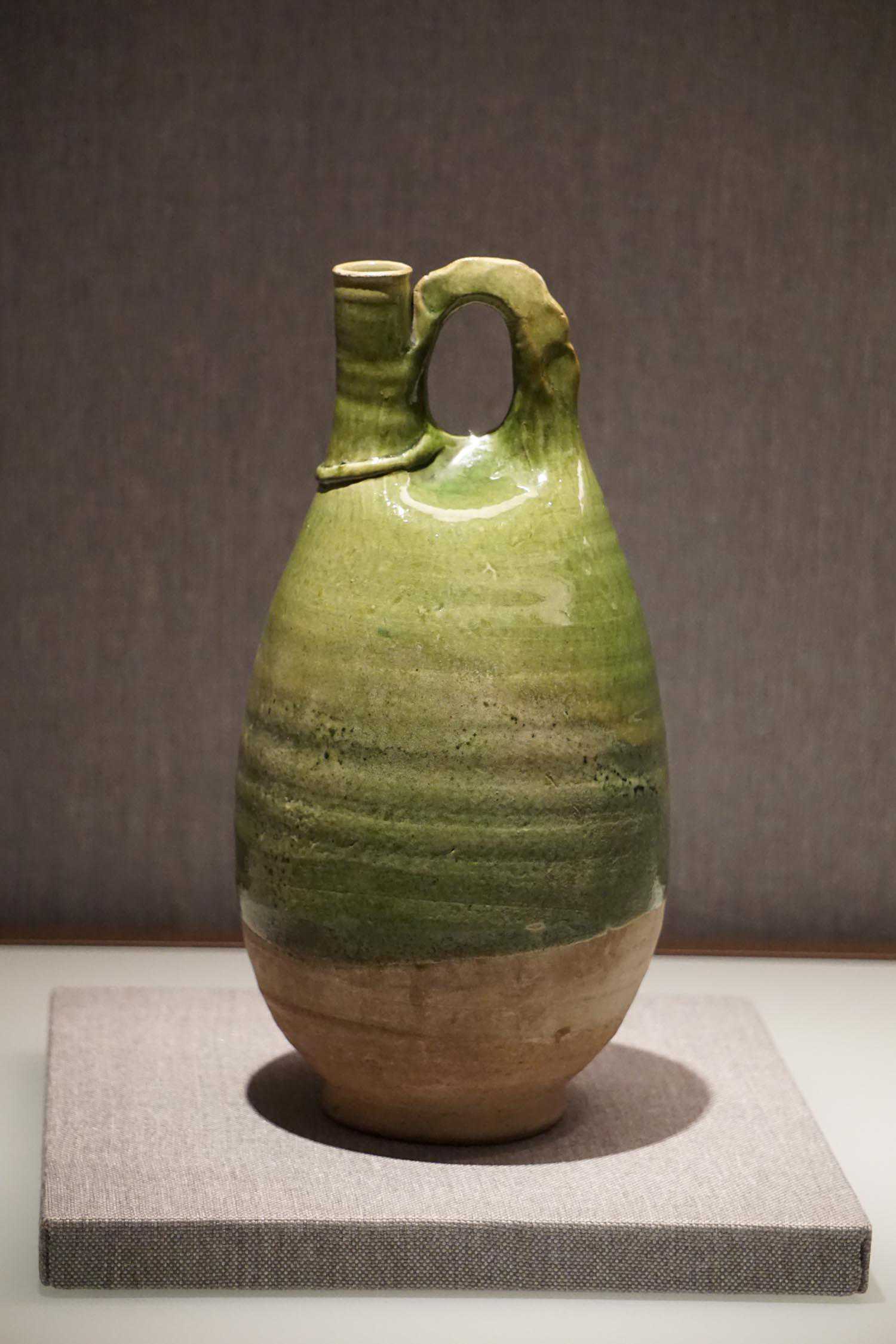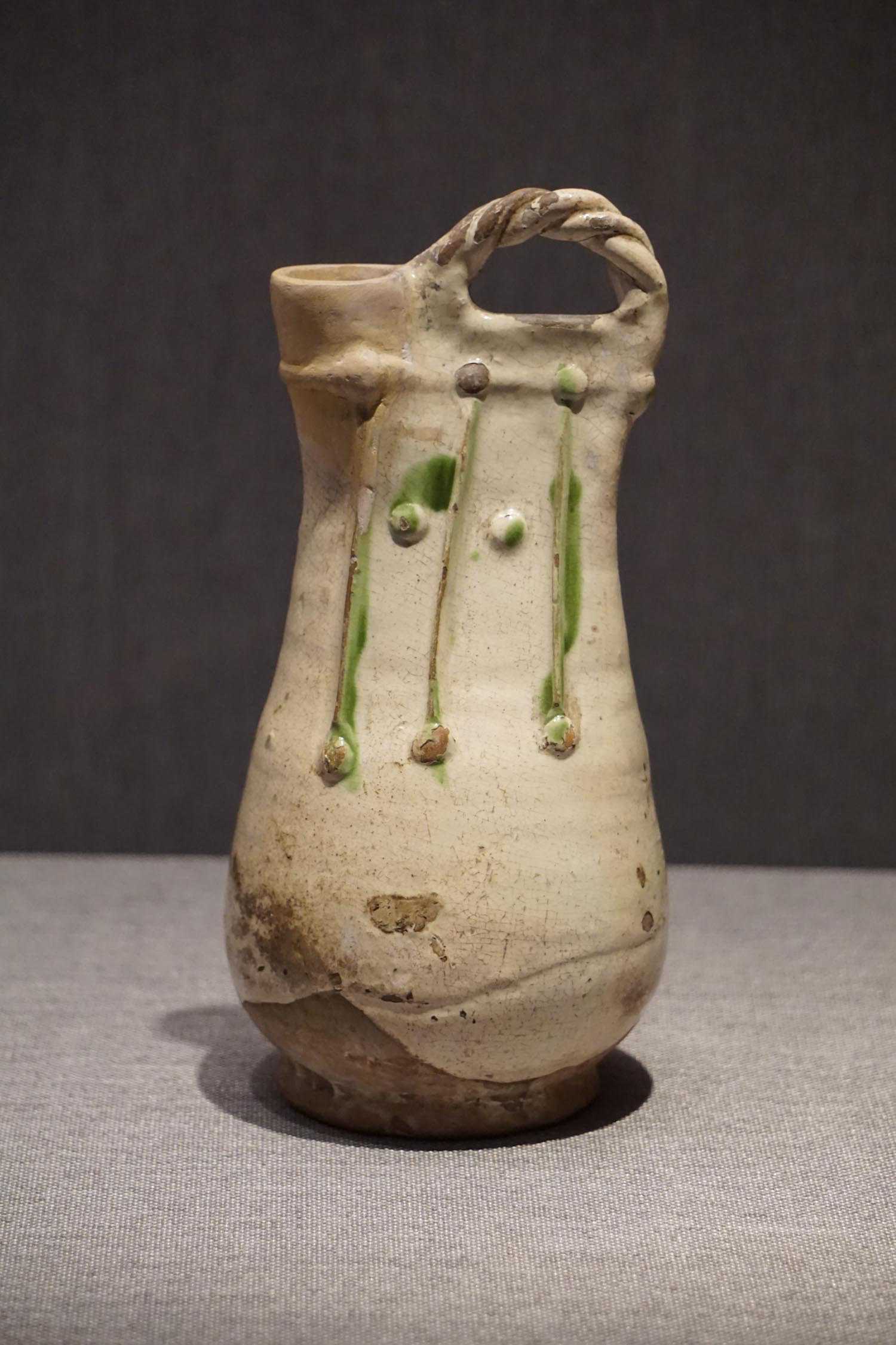 白釉绿彩皮扣装饰单孔鸡冠壶辽