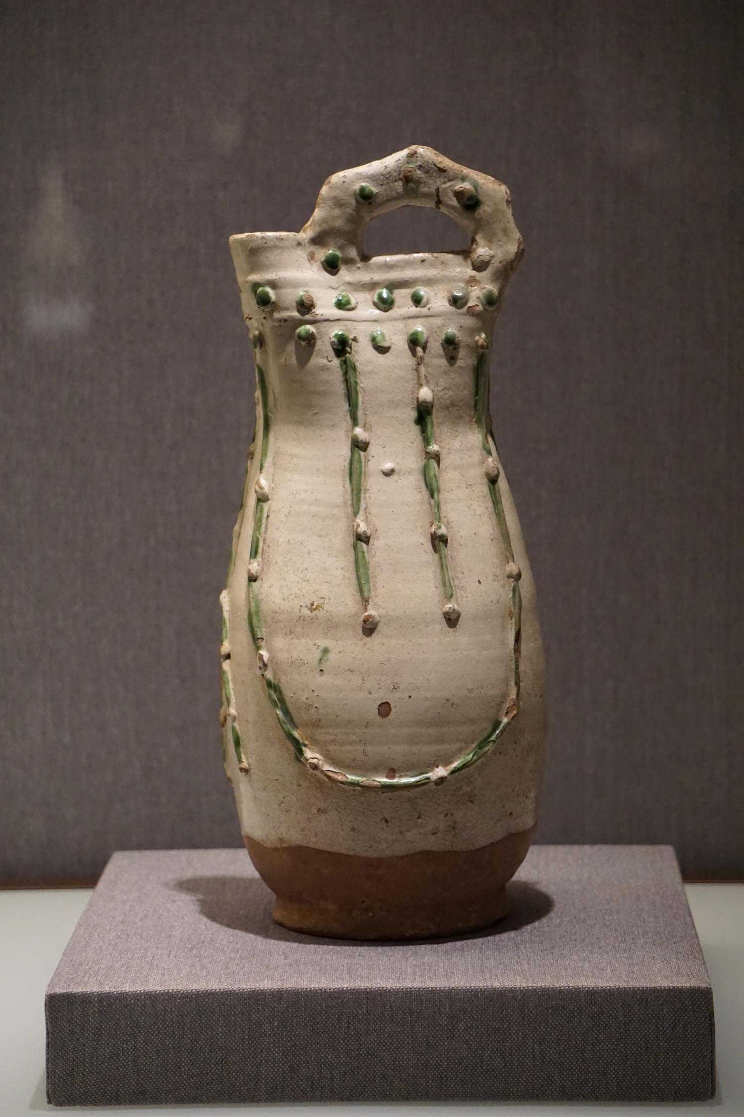 白釉绿彩纽带装饰绳梁鸡冠壶辽