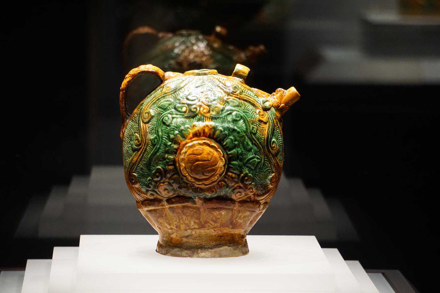 绿釉贴盘龙菊花流云纹双孔鸡冠壶辽