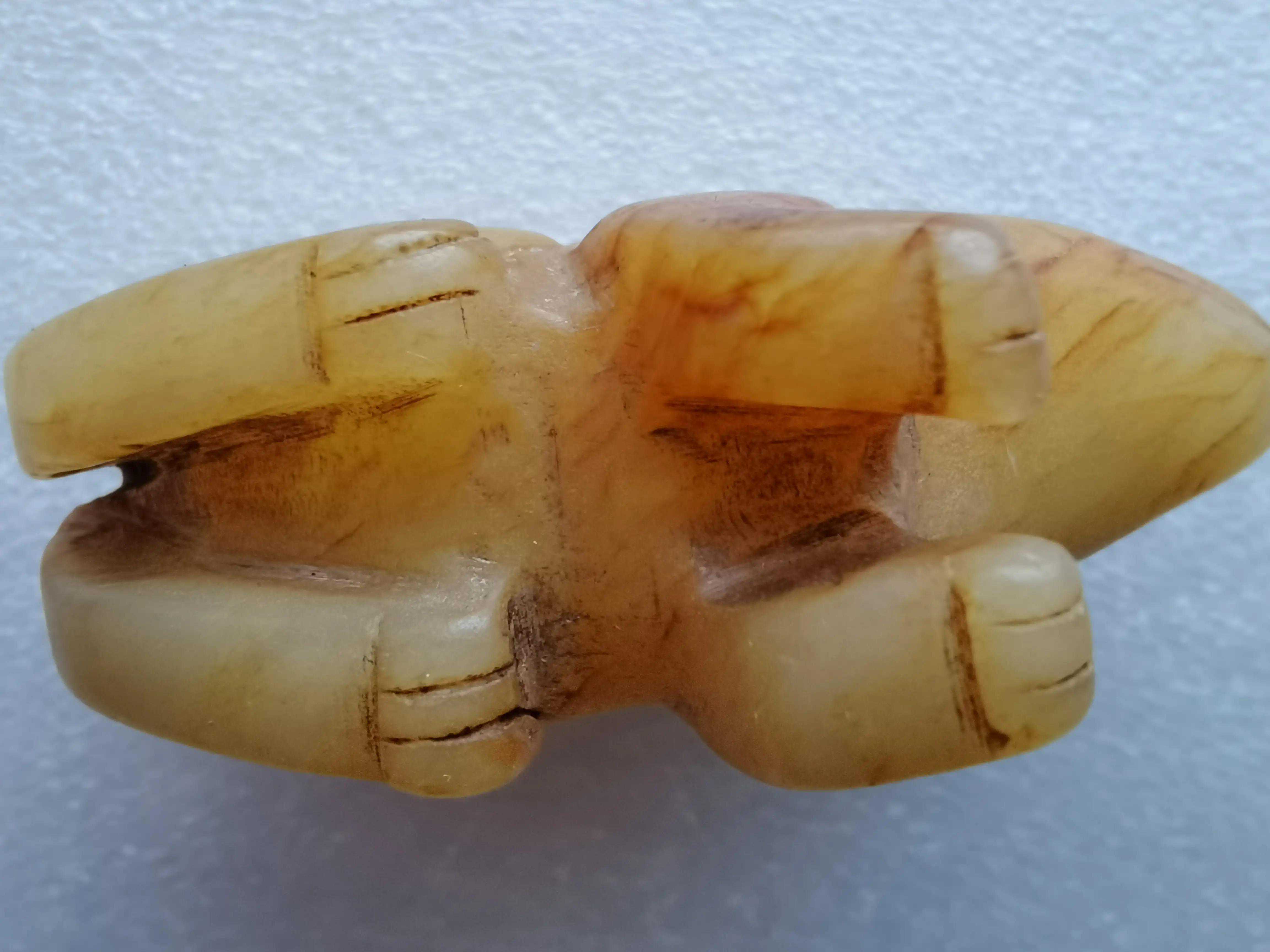 汉代的兔子您见过吗?现在,趴在您面前的就是这样一只兔子。它黄玉质,水滴形眼,夸张的长耳朵,强健发达的后肢,好像可以随时一跃而起。它的老表现在其包浆与沁色上。其包浆润泽,为丝缕褐色沁。其刻划阴线为汉代典型的卷云纹。雕刻精细,没有崩裂等现代电动工具加工痕迹。