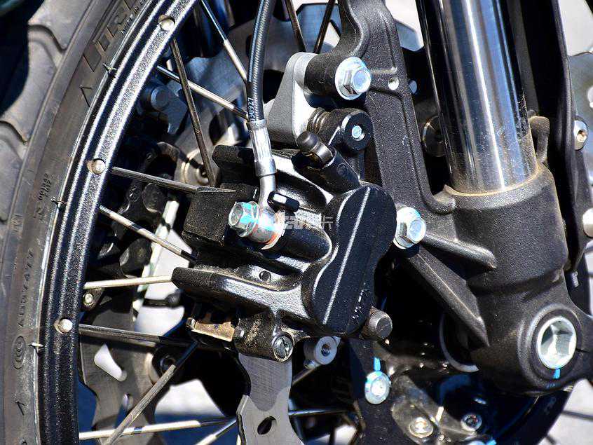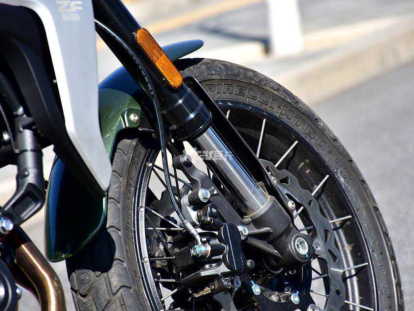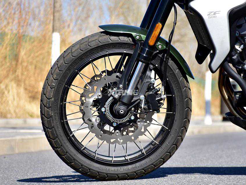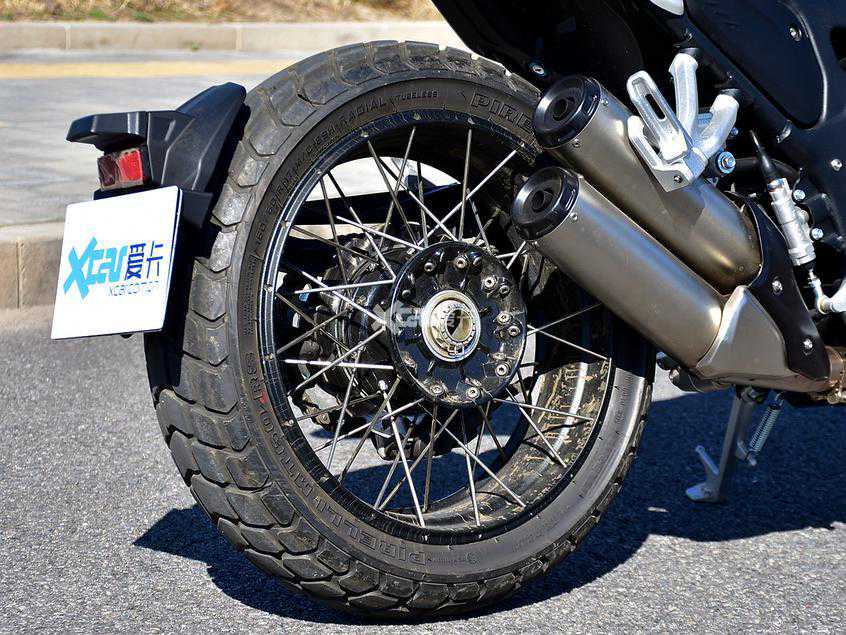 攀爬版与城市版车型均采用了前18寸后17寸的轮圈搭配,而旷野版为前19寸后17寸搭配,其中旷野版与攀爬版均为真空辐条轮圈,具备一定的抗形变能力。此次试驾的攀爬版的轮胎规格为前110/80R18后160/60R17,轮胎由倍耐力提供,型号为MT60RS。