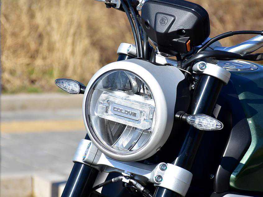 既然是复古街车,圆形复古风格大灯少不了,银色金属护罩的加入为它增添了一分现代感,而标配的LED灯光和灯体内的“COLOVE”浮雕Logo都大幅提升了车辆辨识度。
