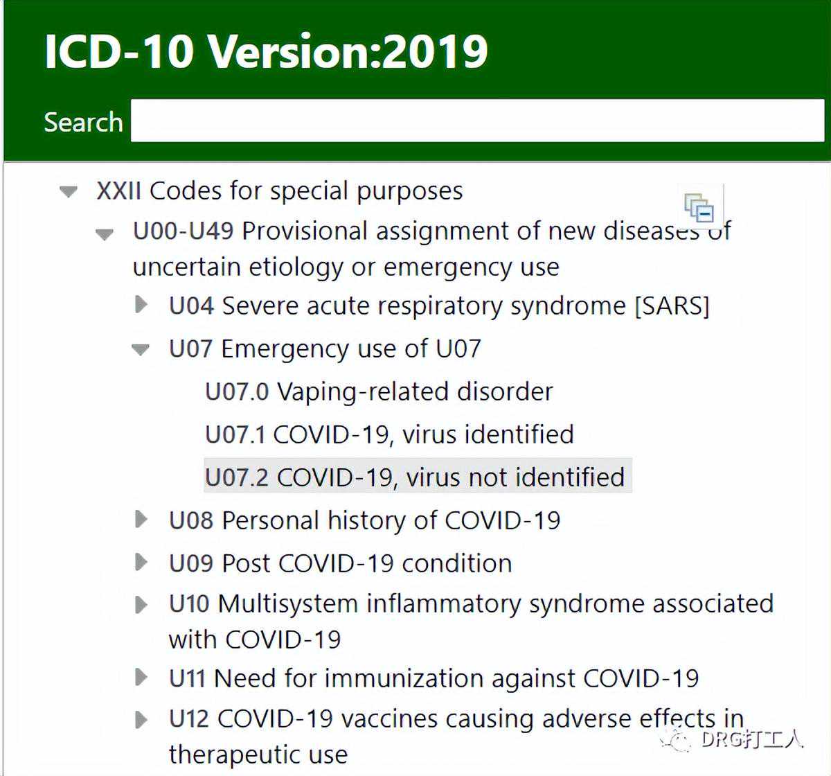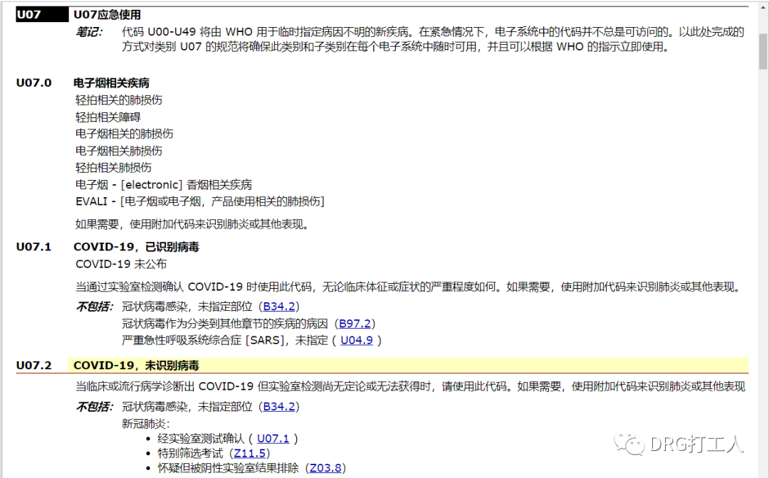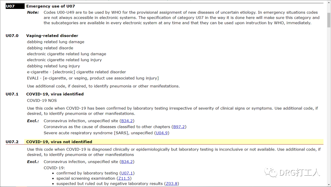 再看,病毒被标明和,病毒未标明,具体内涵见截图。其中有一个特别的地方是,从“不包括”里,可以看到两个可能会用到的编码,的特殊筛查和疑似病例但经过实验室检测排除了COVID-19。