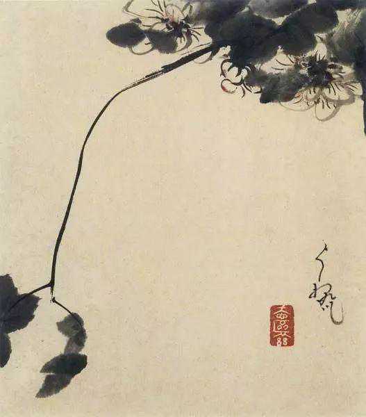 画面中荷梗的“线”与不完形荷叶组成的“面”相结合,使画面富有了变化。荷花用干笔写出形状,其右下角的荷叶是用湿墨画出,左上角未展开的荷叶是用浓墨写出,而荷梗是用淡墨写出的,墨色的干、湿、浓、淡,都在仅有的物象中表现得淋漓尽致。