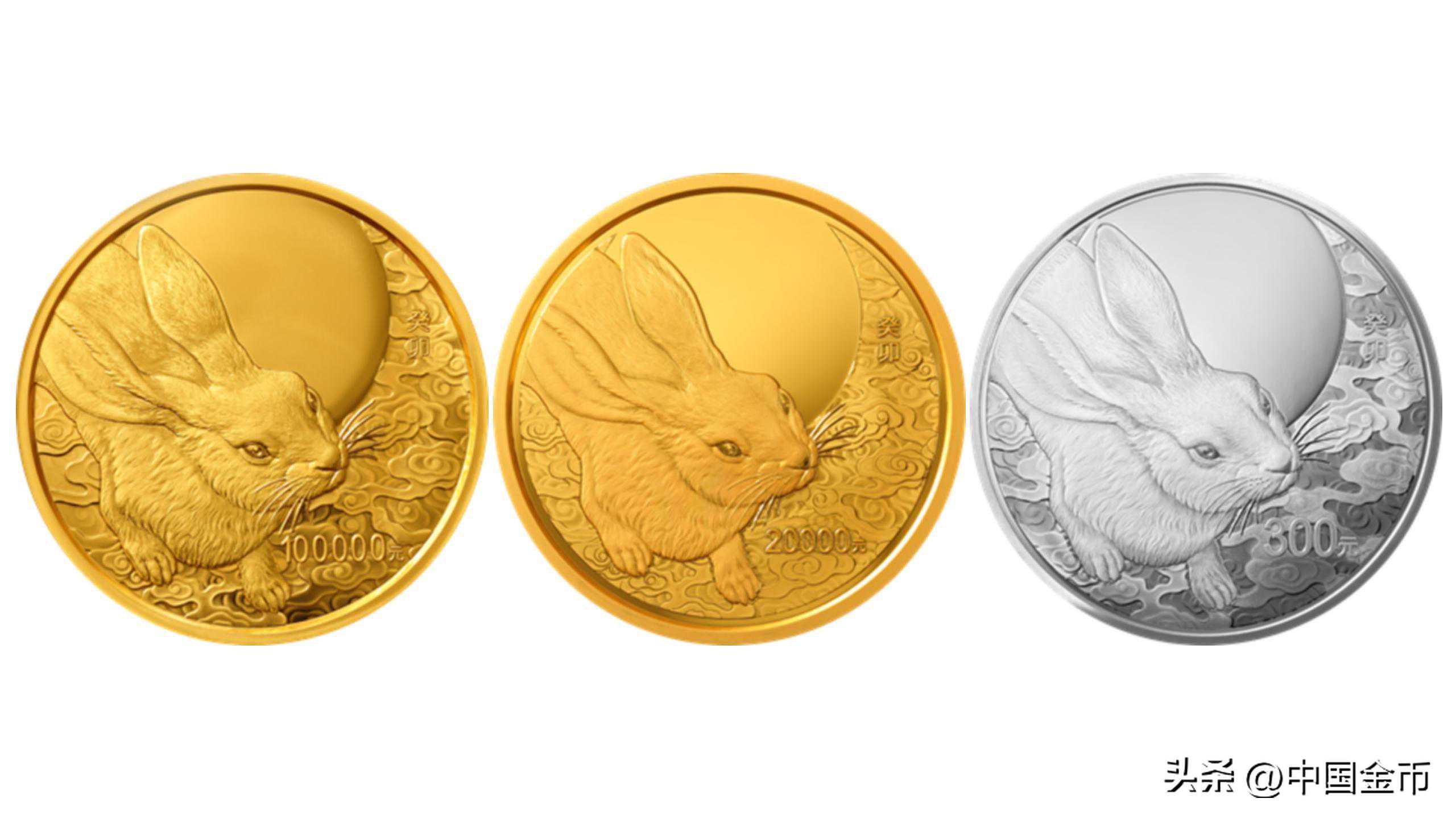 10公斤圆形金质纪念币、2公斤圆形金质纪念币及1公斤圆形银质纪念币背面图案均为写实兔造型,衬以月亮、祥云组合设计。币面上的“奔兔”造型,严谨准确又生动自然,是一只在原野上自由奔跑的野兔。这三枚纪念币采用镜面底面的多层次喷砂,充分体现出币面的空间层次感,且都是大规格金银币,直径规格分别为180毫米、110毫米、100毫米,尺幅大,气象也就开阔。