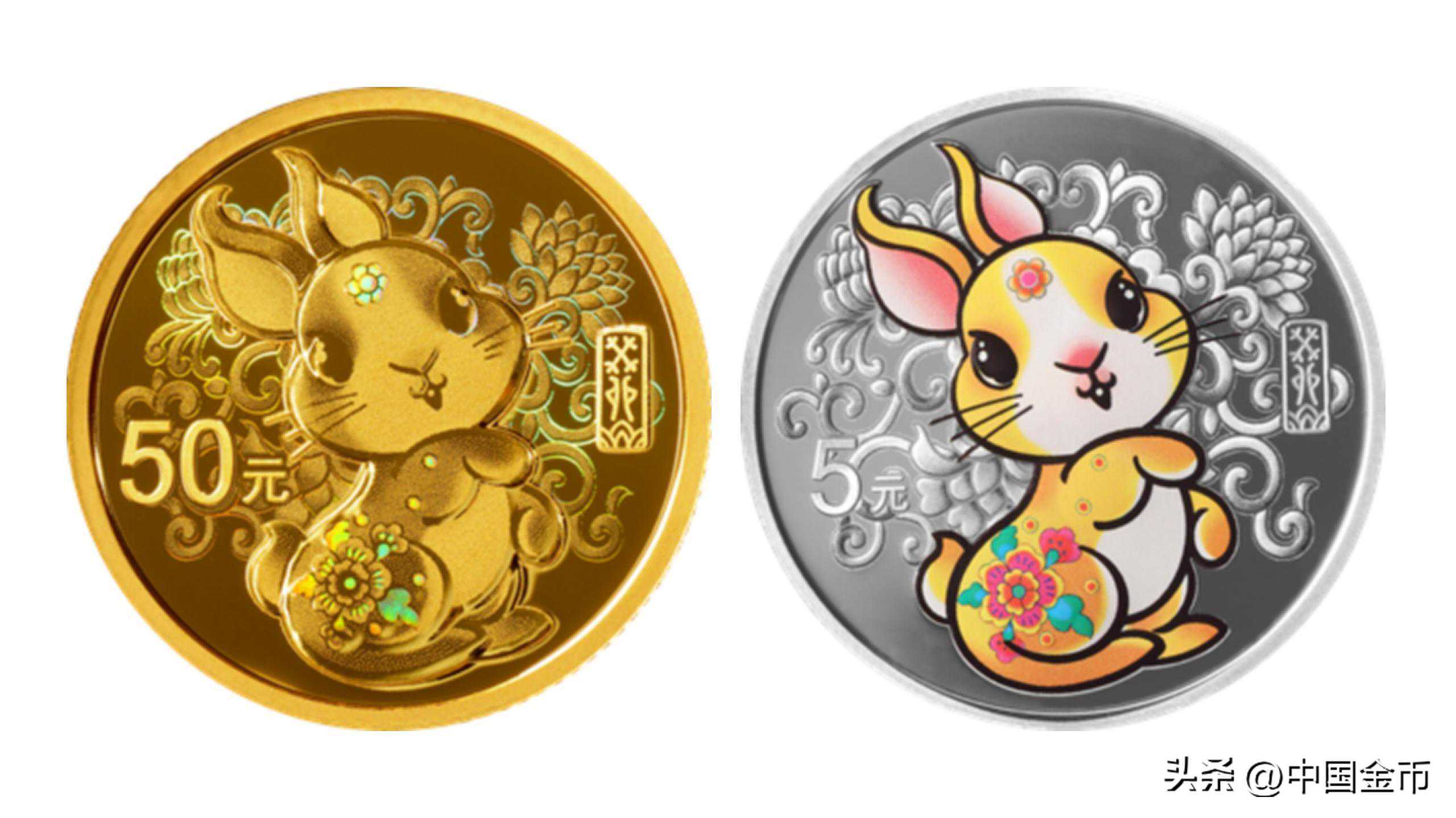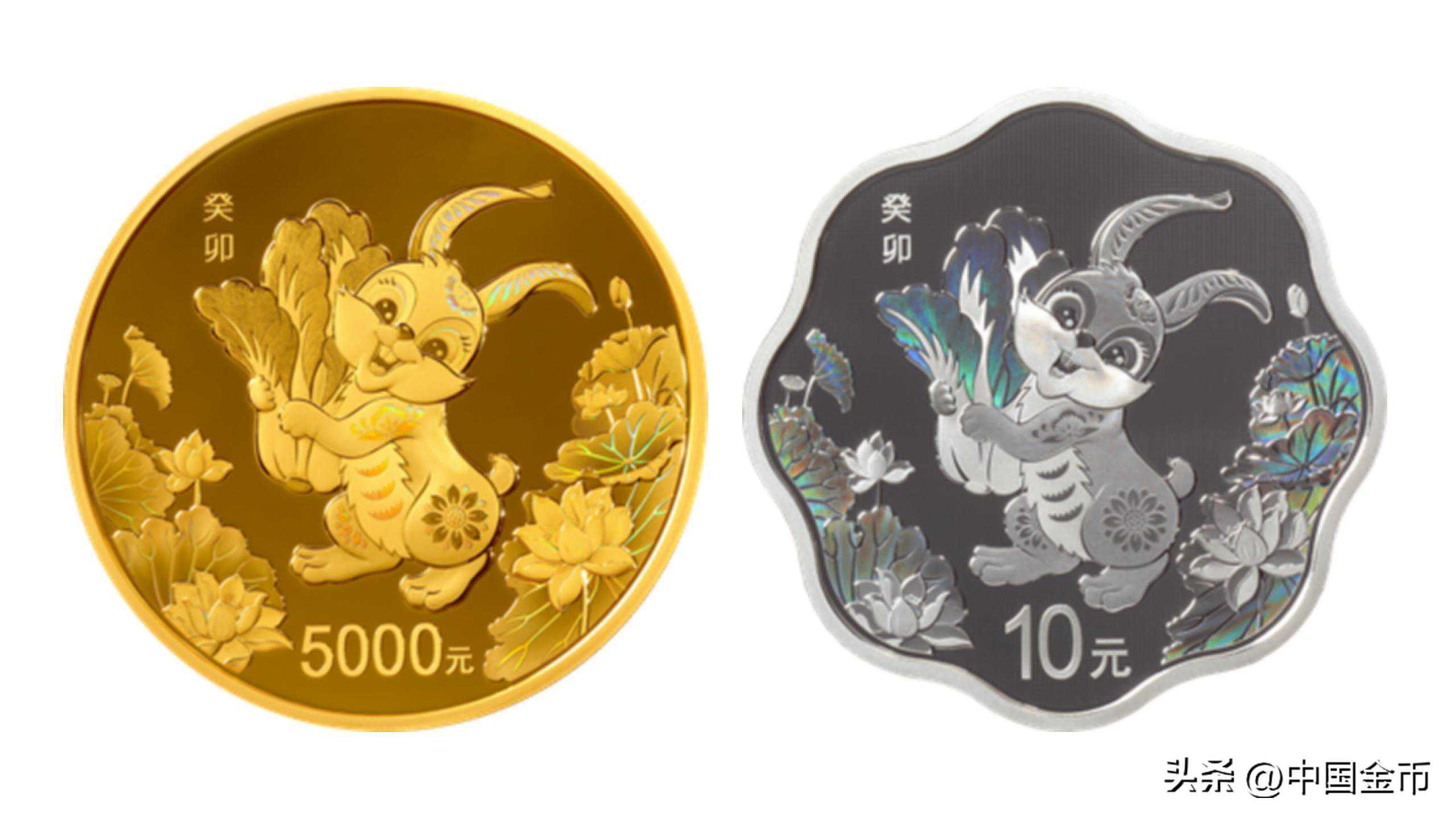 500克圆形金质纪念币及30克梅花形银质纪念币背面图案均为装饰兔及白菜造型,衬以荷花、荷叶等组合设计。装饰造型的兔子抱着一颗“百财”左右都是荷花,满满都是吉祥寓意。两枚纪念币的背面图案上采用了光变鳞彩工艺,使得我们从不同角度观赏纪念币的画面,能看到五彩斑斓的颜色,流光溢彩,十分灵动。