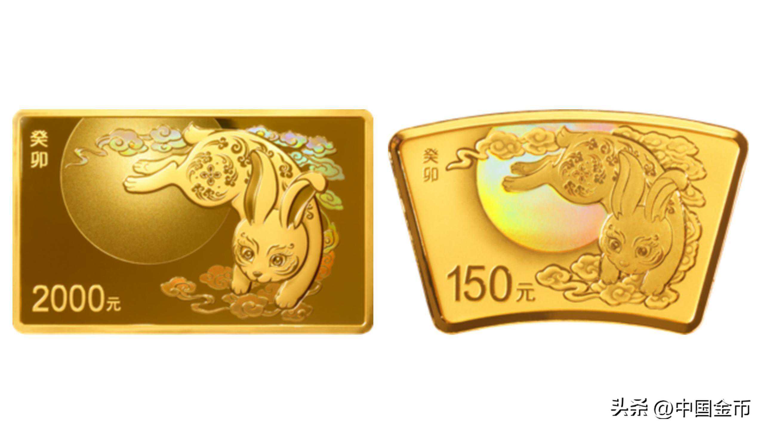 150克长方形金质纪念币及10克扇形金质纪念币背面图案均为装饰兔造型,衬以月亮、祥云组合设计。兔子、祥云和月亮,这三个元素都具有强烈的中国传统文化特色和底蕴,结合在一起,呈现的主题为“祥云献瑞,玉兔启福”,表达对美好生活的祈愿。