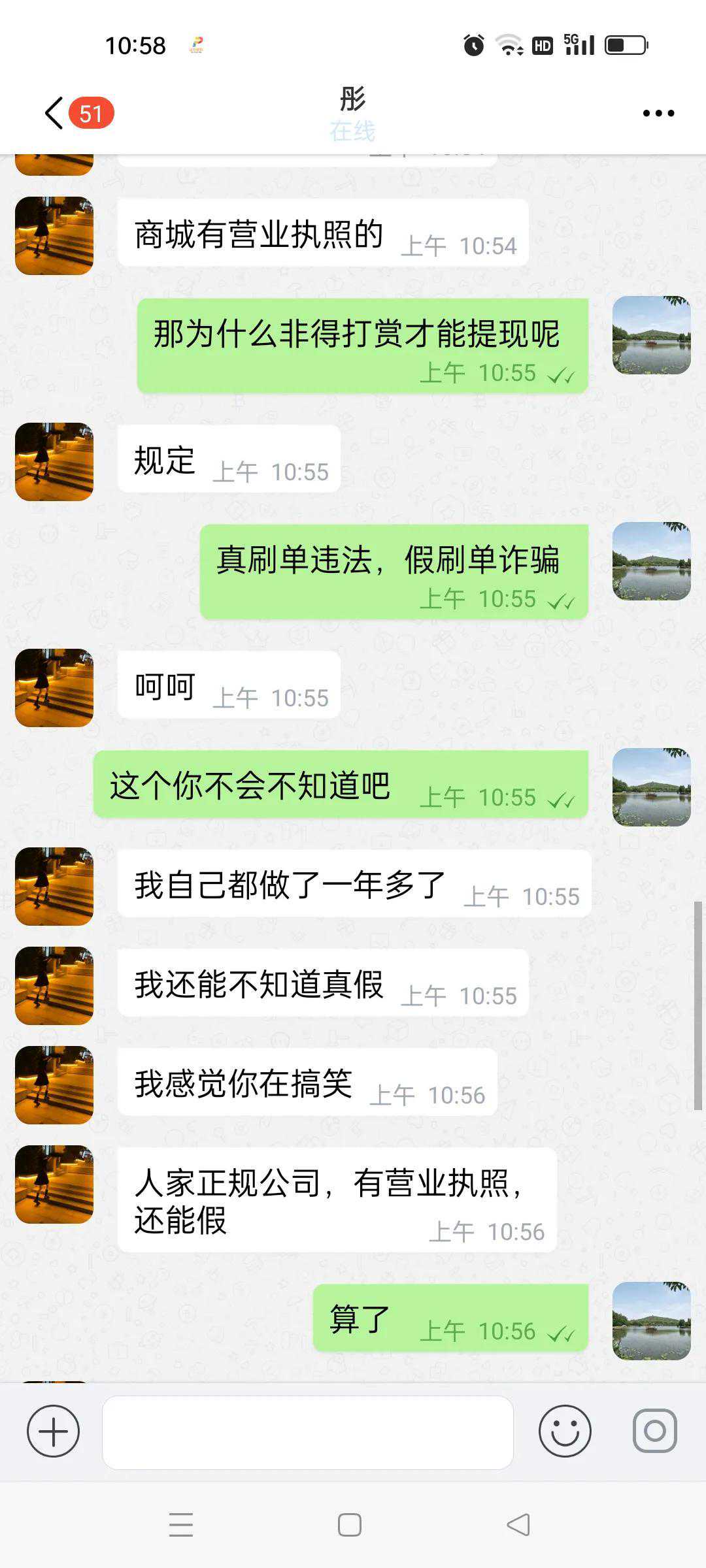 刚开始它们的态度,还算是个人,尤其是这个一直跟我联系的“彤”(yutong)。它简直每天都很殷勤地跟我发“你好”,我有时注意不到就没有及时回应。后来它看我确实也不上钩时,就开始各种爆粗口,真是人类中的败类,黑心哪天坑害了它自己。我怼了它几句,之后我的账号就显示我直接被退出来了,然后我就果断卸载了这个品拍软件。