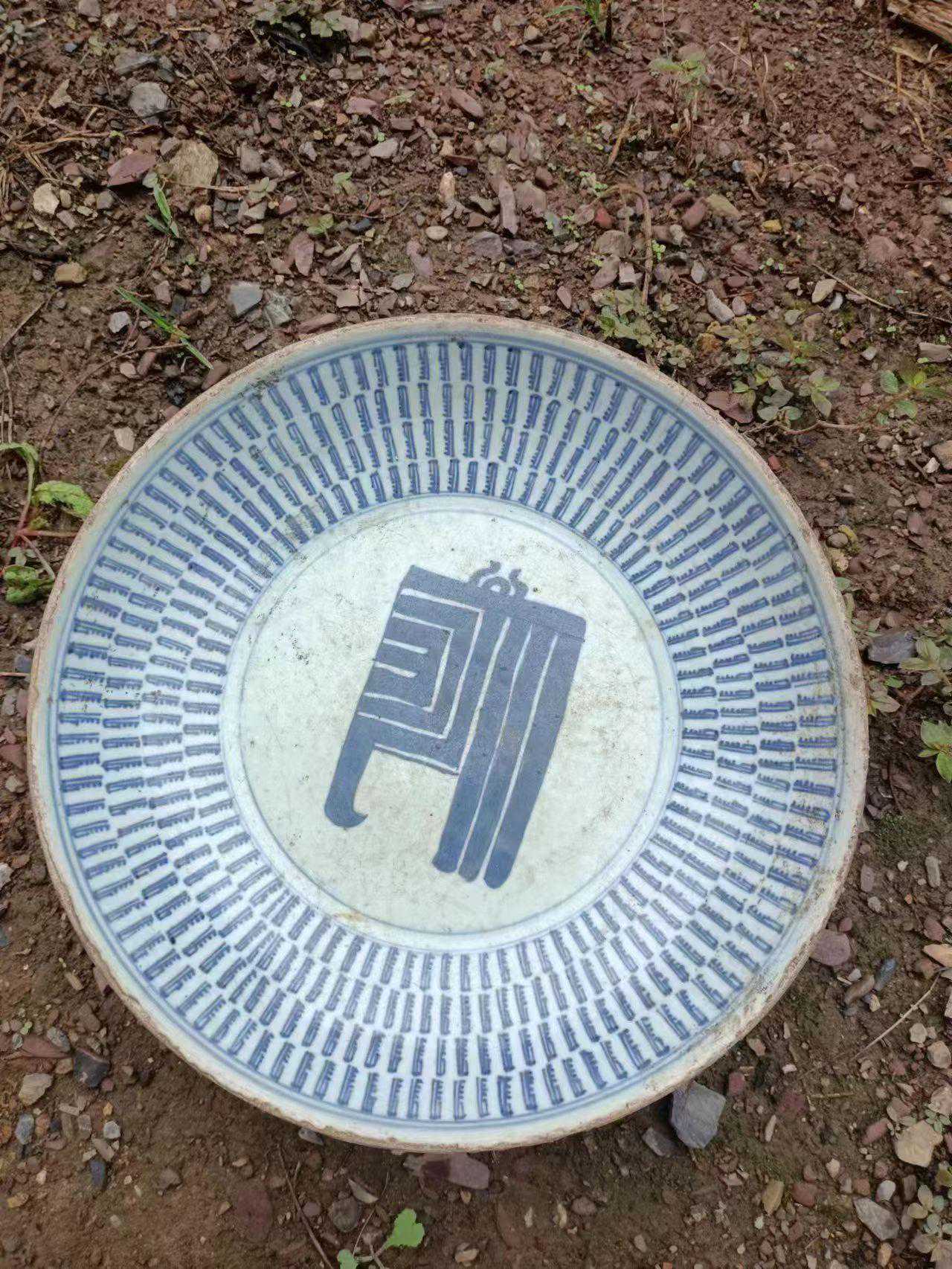 曾有人1997年在北京官园附近平安大街工地拣到一块明瓷残片,明万历官窑青花梵文碗标本。这是梵文,它是六字真言:“唵、嘛、呢、叭、咪、吽”的一部分。底部尚存“制”字和“万”字的左下角,底款应当是“大明万历年制”六字款。这件残瓷片,可以佐证乾隆青花梵文“寿字盘”的梵文大意。