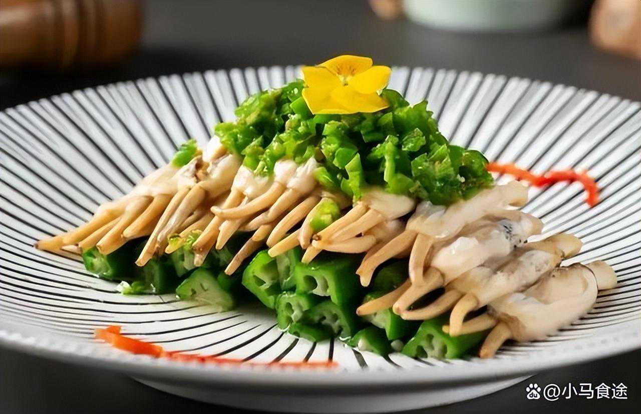 1.将蛏子用淡盐水浸泡2小时,吐沙,捞出沥干。再将蛏子放入开水中,煮至刚张开壳,捞出扒肉备用。将秋葵沸水透凉切段码入盘中,在将蛏子码上备用。