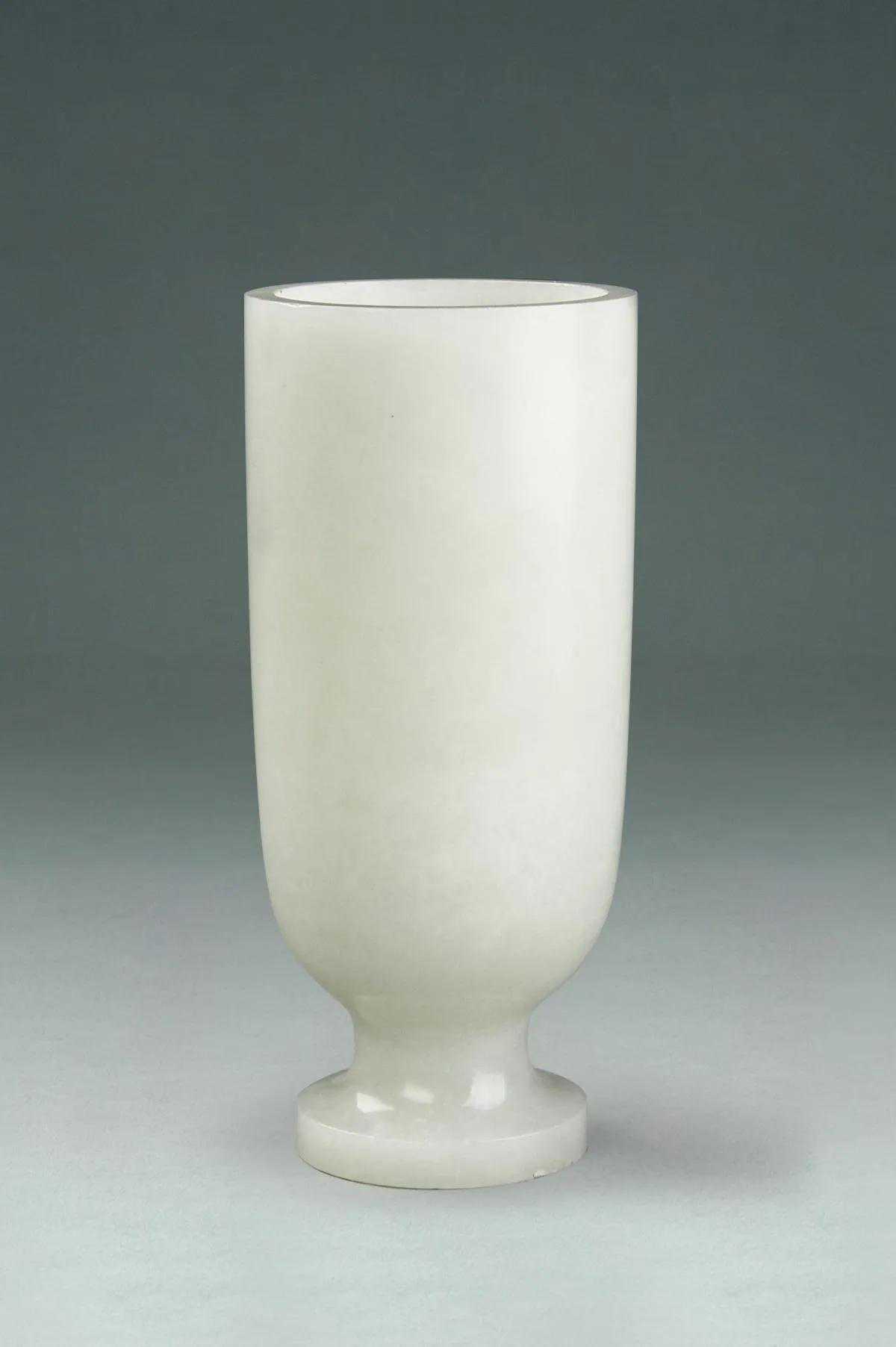 经专家考证,白玉杯为墓主人生前饮酒的实用器。白玉杯杯高11.8厘米,口径5.2厘米,底径4厘米。玉杯呈圆筒形,直口,深直腹。通体以名贵的新疆和田羊脂玉琢制而成,玉质莹润细腻,杯壁厚薄均匀,杯身抛光极好,整体线条流畅,无纹饰,却尽显古朴雅致。