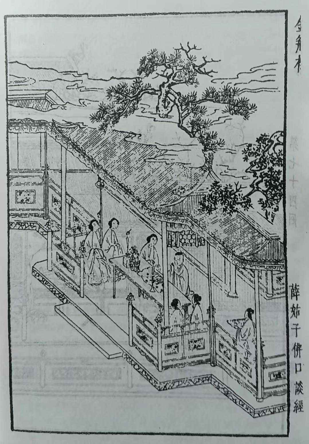 薛姑子宣毕卷,已有二更天气。先是李娇儿房内元宵儿拿了一道茶来,众人吃了。后孟玉楼房中兰香拿了几样精制菓菜,一坐壶酒来,又炖了一大壶好茶,与大妗子、段大姐、桂姐众人吃。月娘又教玉箫拿出四盒儿细茶食饼糖之类,与三位师父点茶。李桂姐道:“三位师父宣了这一回卷,也该我唱个曲儿孝顺。”月娘道:“桂姐,又起动你唱。”郁大姐道:“等我先唱。”月娘道:“也罢,郁大姐先唱。”申二姐道:“等姐姐唱了,等我也唱个儿与娘们听。”桂姐不肯,道:“还是我先唱。”因问月娘:“要听什么?”月娘道:“你唱『更深静悄』。”当下桂姐送众人酒,取过琵琶来,轻舒玉笋,欵跨鲛绡,启朱唇,露皓齿,唱道: