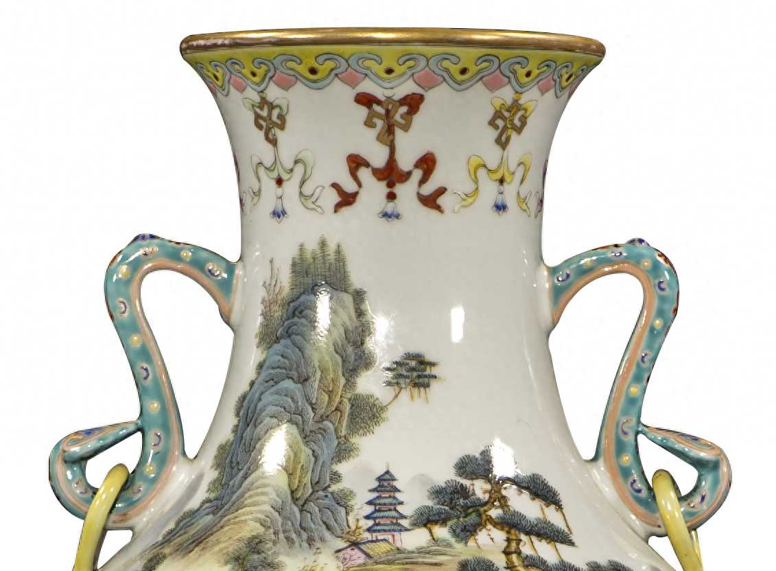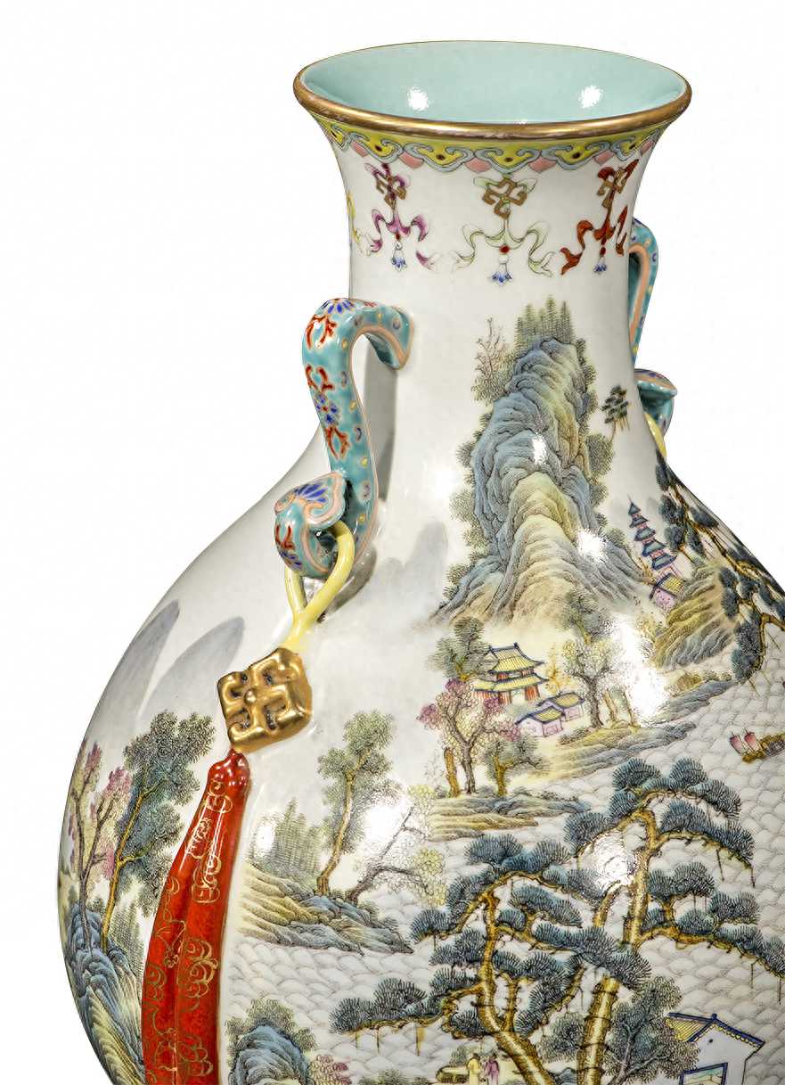 由上可见运用此耳饰的高端御瓷之中唯独本品使用通景山水楼阁题材装饰,至为珍罕,同时借助耳饰的传统造型又点明清宫追求寓意吉祥的本义。
