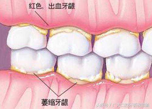 牙龈会随着牙槽骨的萎缩而萎缩,龈边缘下降后会在牙齿表面留下印记,并且牙齿表面还会发黄。