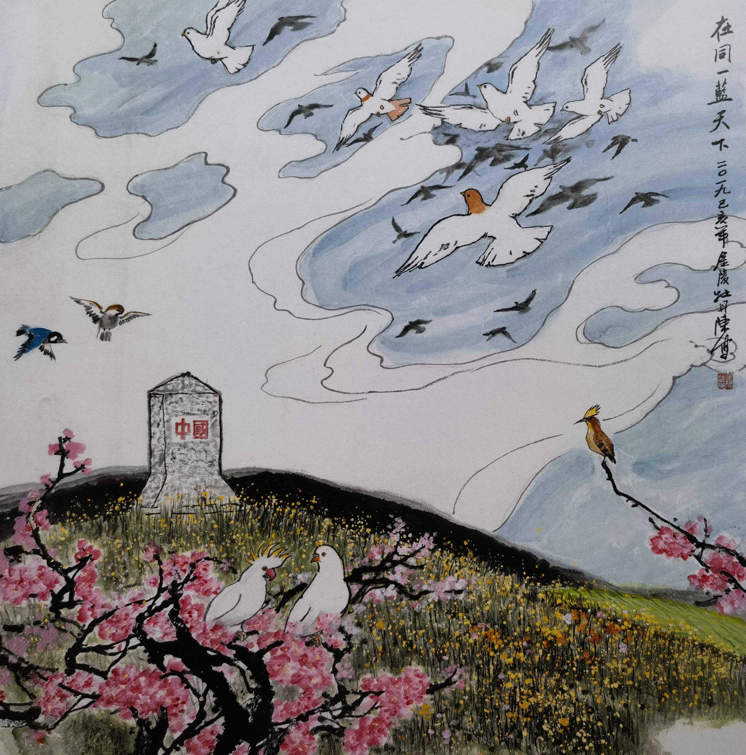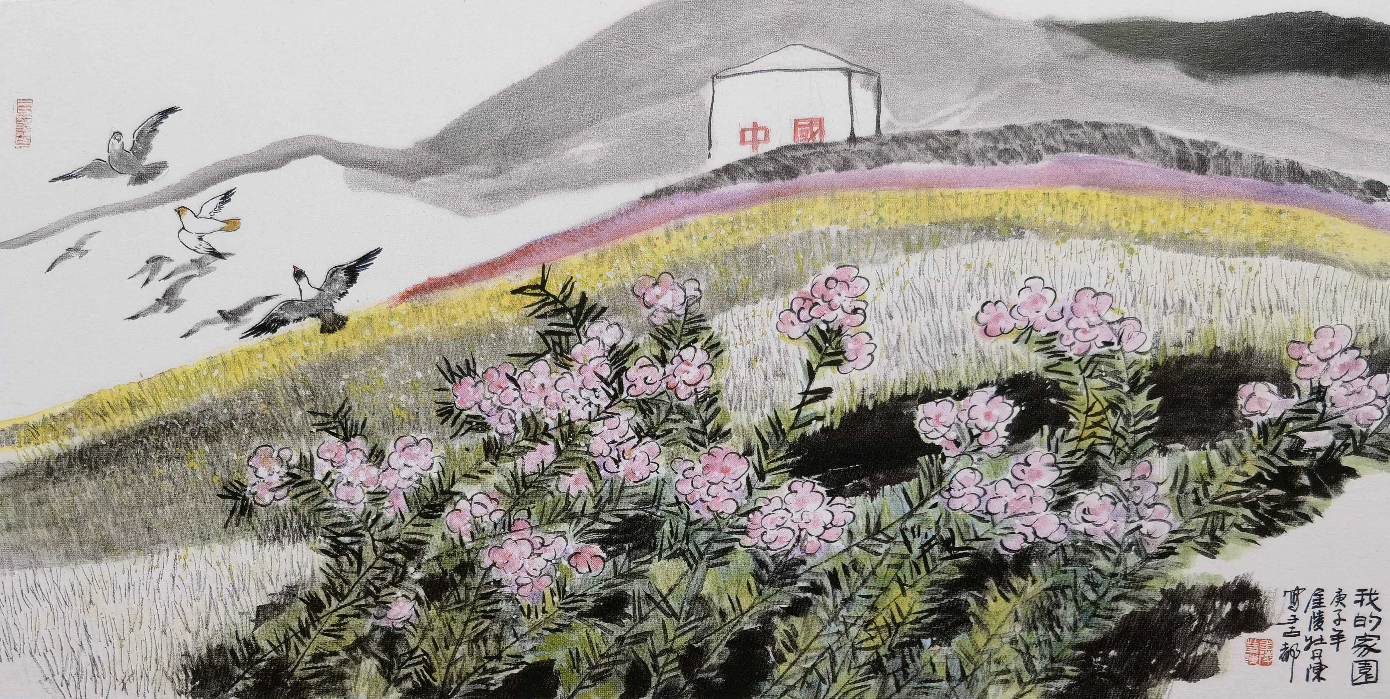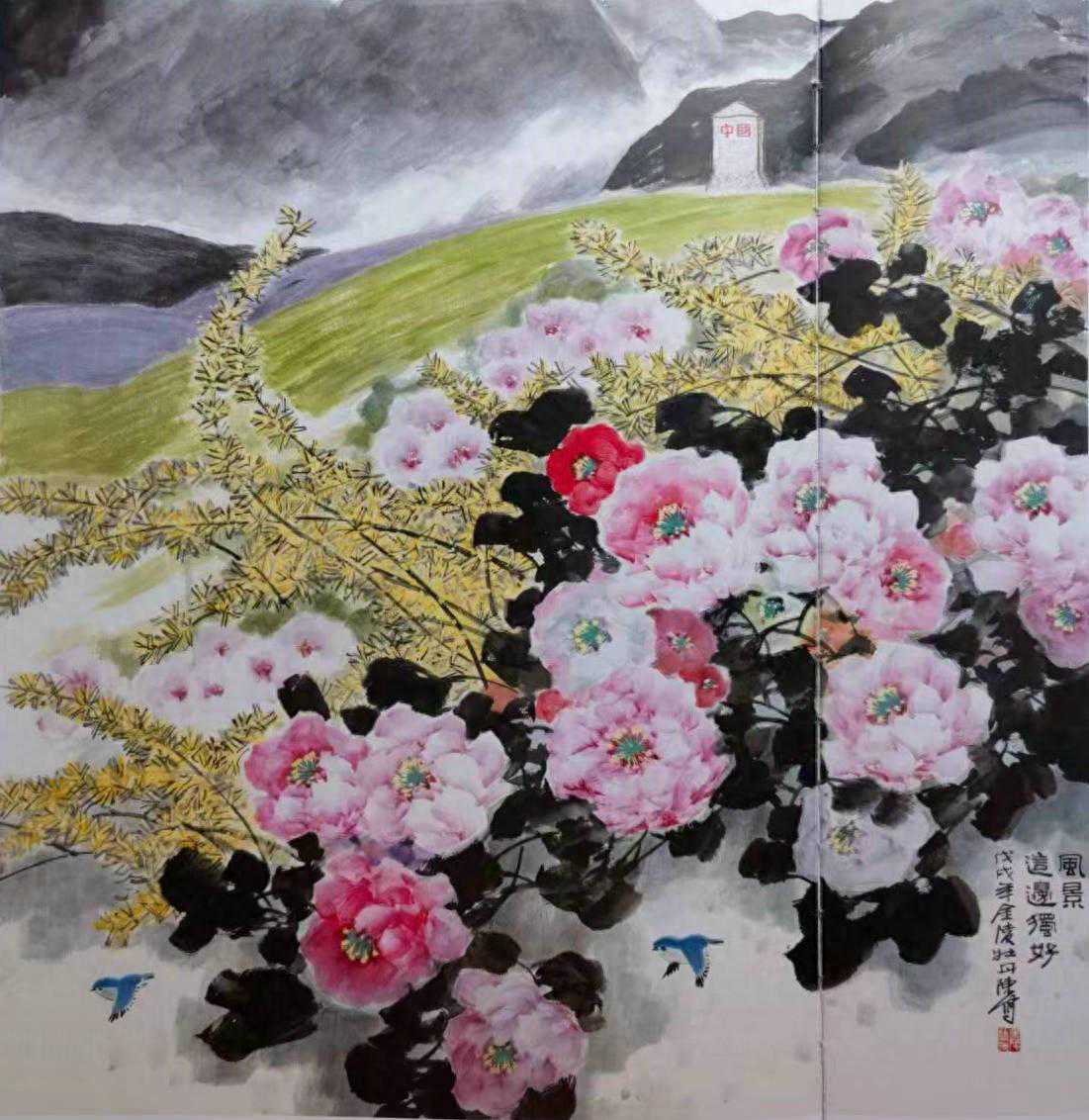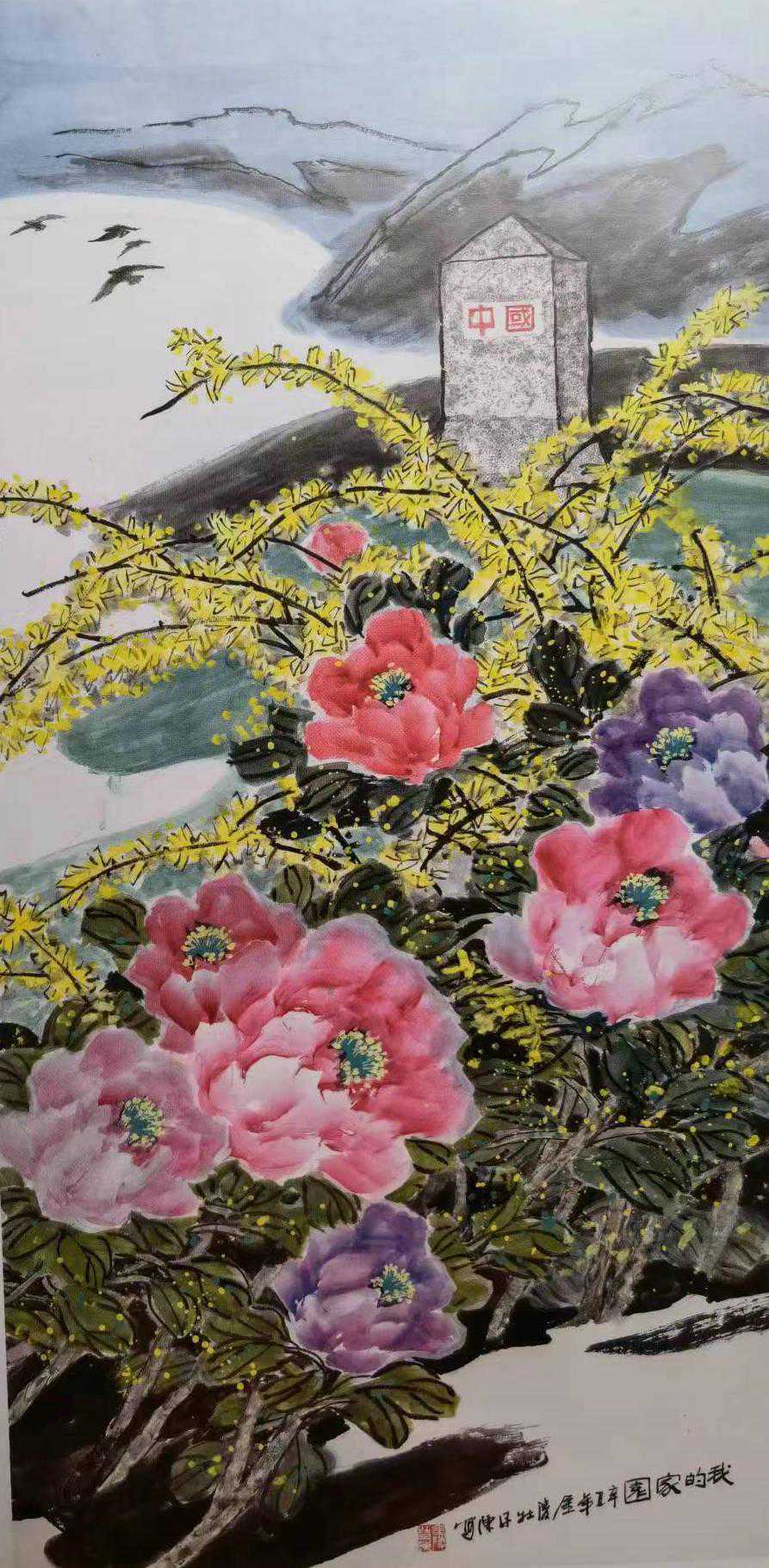 我打开"金陵牡丹陳"画集,其中《我的家园》《风景这边独好》《在同一蓝天》引我注目。画面牡丹盛开,迎春花枝飞扬,一派繁荣兴旺景象,反映我们的社会、国家当前的状况。再仔细看,画面有一个国界碑,碑上耀眼"中国"两个红字,让人一目了然,这就是我们的祖国.