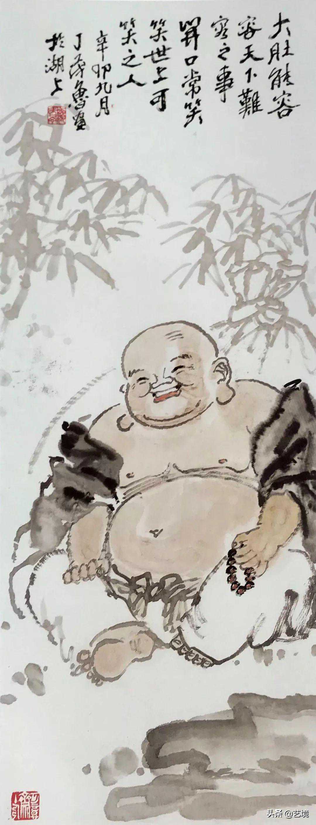 从艺至今半个多世纪,一直钟情于写意人物画的丁茂鲁看来,找到妥当的造型程式和创作的题材很重要。题材要吸引人,描绘的人物要有趣味,合理利用水迹、皴擦、夸张色彩等艺术手法的处理,熟练地将其表现完善,并注意题字、盖章与画面形成的整体关系,再做到构图新颖,这就是比较优秀的画作了。“作画用笔要沉着、有力度、以书入画,融入金石意趣,其线条、墨块才能更耐看。”他的代表作,牧童图、弥勒图等都能灵动地反映出他泼墨赋彩之法的出神入化,同时可以看到更多的闲适和脱胎自李可染陆俨少先生的那一路对传统笔墨精神的皈依。