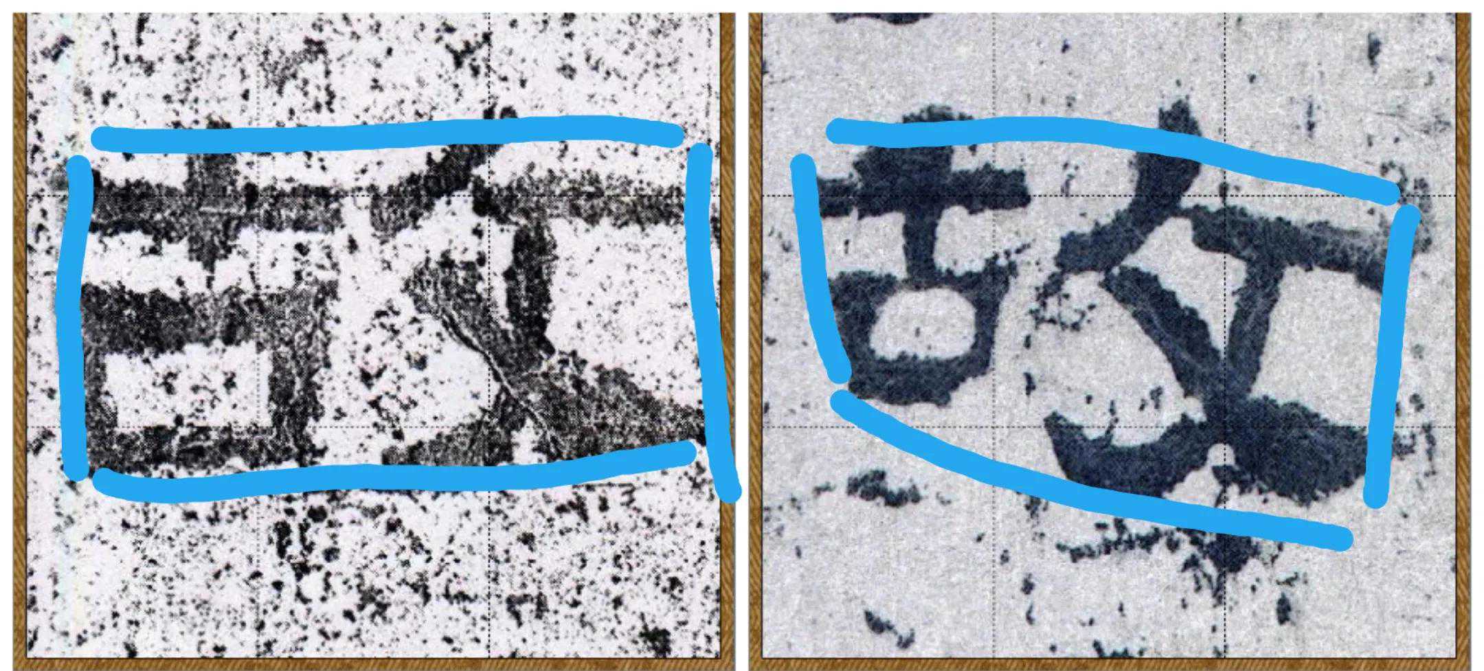 碑阴的“节”下边部分中间是分开一块明显的空间,而碑阳比较紧密。碑阴中另一个草字头的“范”也符合这个规则。“卩”部分碑阴是四边形,碑阳是三角形。
