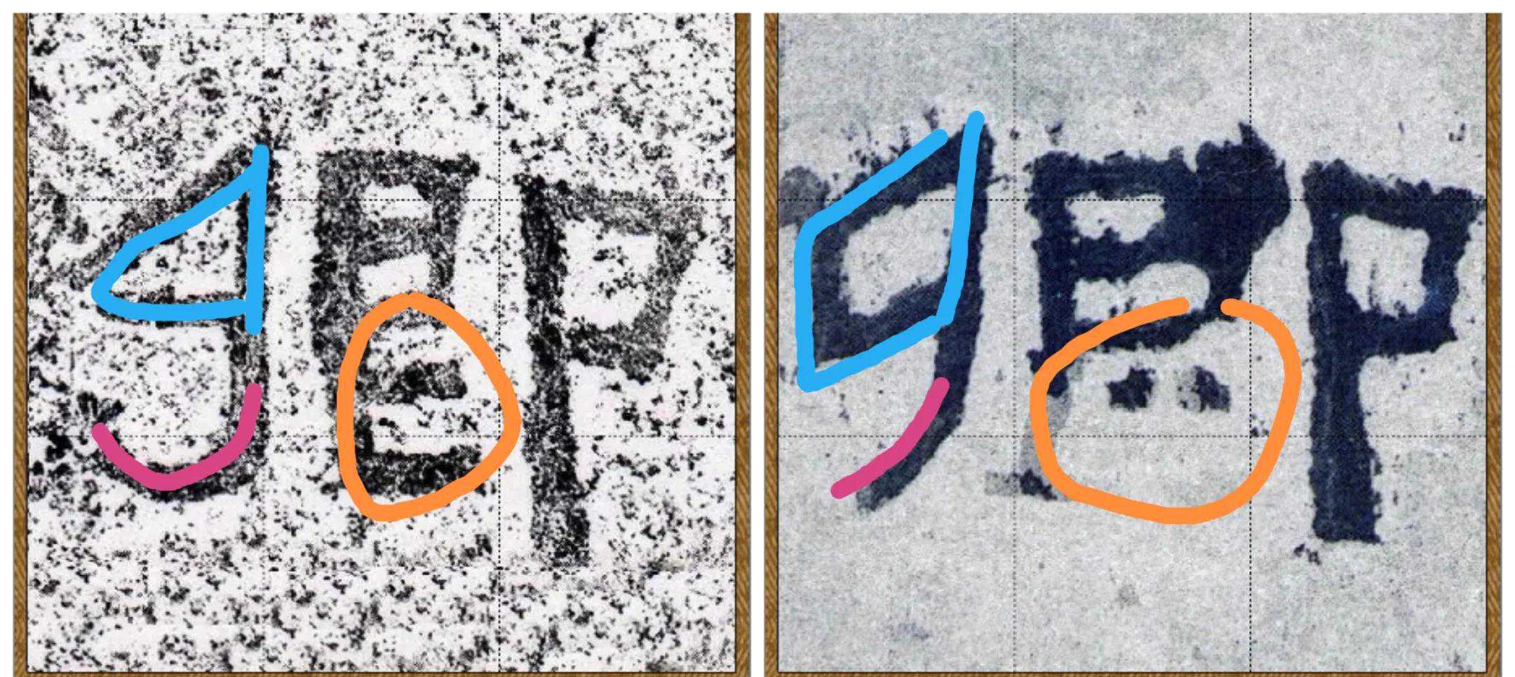 两个“吏”字,碑阴和碑阳外形正好相反,碑阳部分口字内收加大了空间的疏密关系。