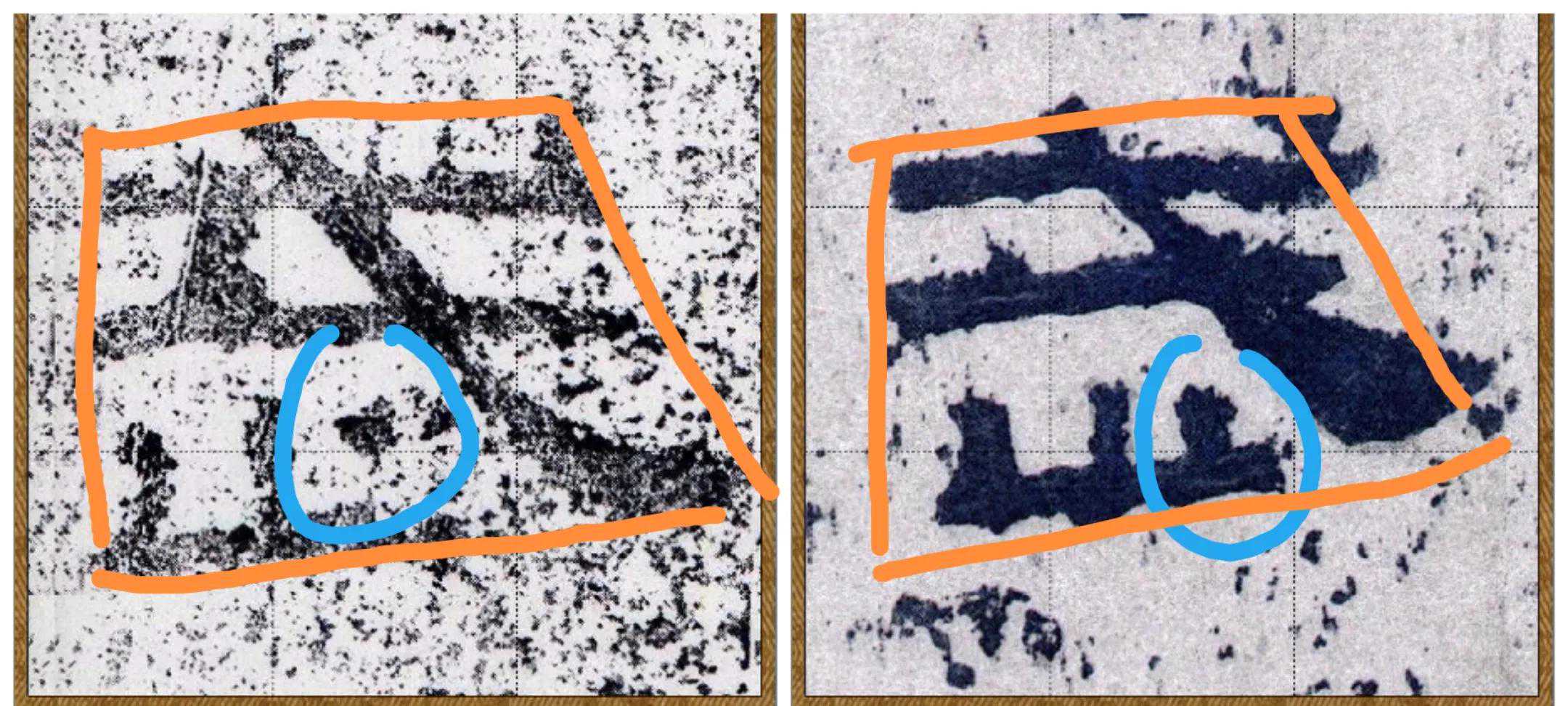 碑阴碑阳“公”字三角形的大小决定了笔画间的疏密空间。碑阴显得均匀,碑阳显得中空。