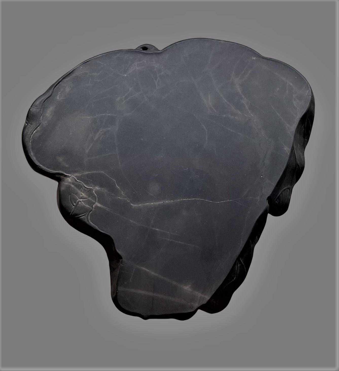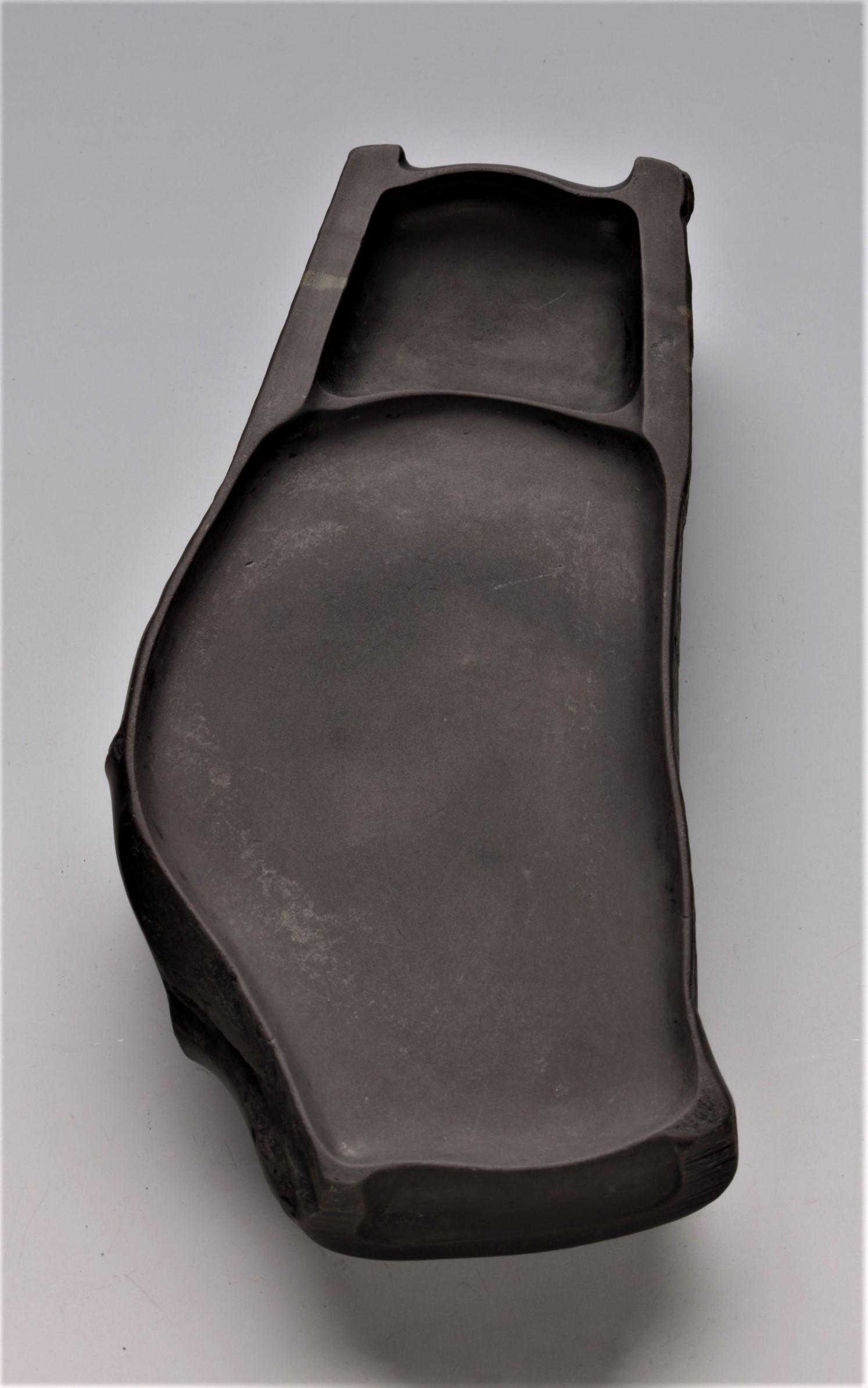 老坑石。石质致密坚实。有翡翠纹。雕工依砚材的自然形态,刻成山崖洞石之状。