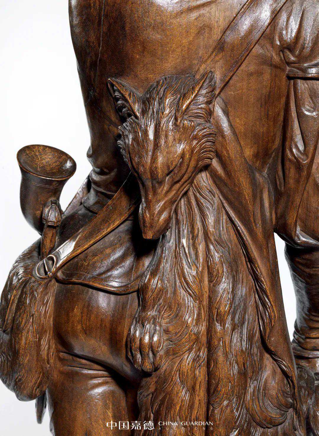 此对出自意大利著名雕刻家贝萨雷尔之手的大型胡桃木猎人雕塑,原收藏于英国著名的斯托克萨伊庄园中庭。
