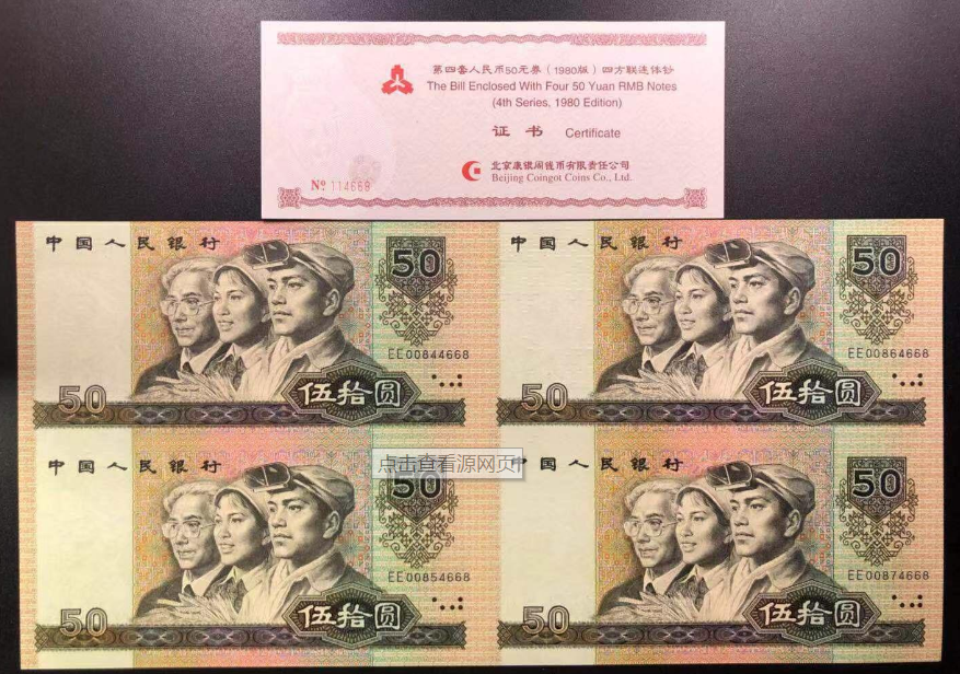 80版50元四连体发行于2006年总面值200元,发行数量为20万套,发行之初价格在280元左右,目前市场价格在5300元左右。