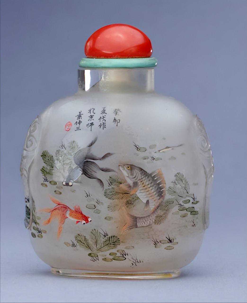 其中的内画鱼藻鼻烟壶,通高7.5厘米,腹部宽5.8厘米。整体浑圆,两侧面雕饰兽面衔圆环。烟壶腹部两面饰相同的鱼藻纹,金鱼、鲤鱼自由地嬉戏,其中一面的左上角书有“癸卯夏伏作于京师”款。