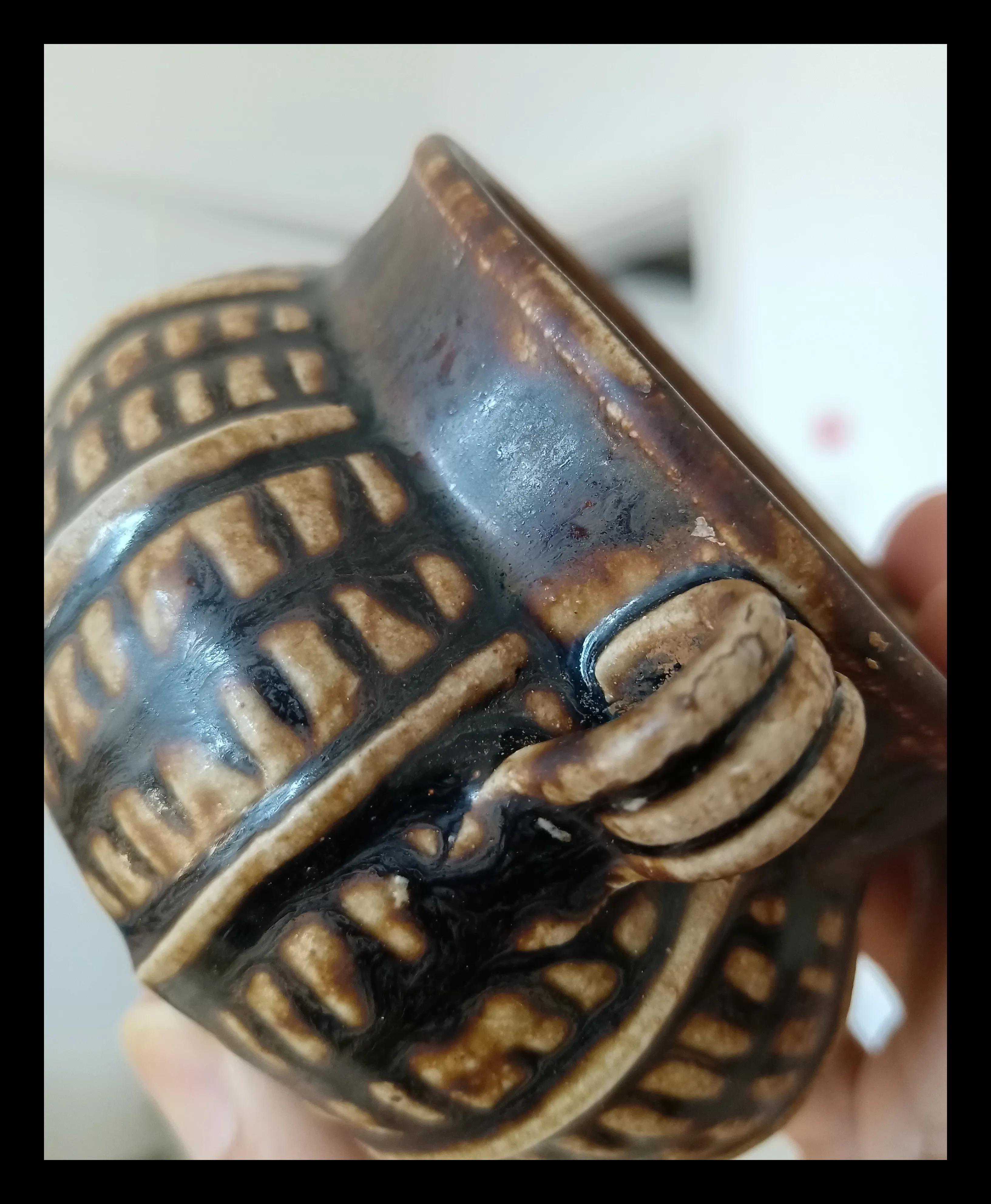 釉面的熔融状态很好,极具流动感,口部和出筋线釉薄显现赭色,施釉未到底,釉从上到下逐渐近加厚,釉厚处显深黑色,流釉明显,底部积厚釉显深黑色;