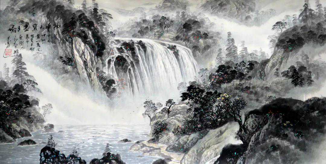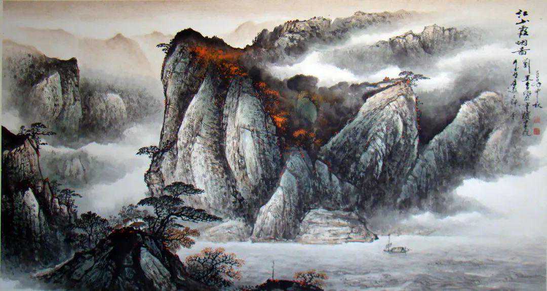 徐墨然先生以其书画创作和艺术理论成就脚踏了两座艺术高峰,成为一位书画界的传奇。“鹰羽皴法”是徐墨然先生对中国山水画创新的一大贡献。墨然先生多年来潜心体察山水画的博大和精深,将自然山川的悟化形诸于笔端,创研出一种新的山水皴法——鹰羽皴。皴法可以说是山水画的生命,具有了独特的价值地位。他以独创的皴法,确立了自己在书画界的高度。墨然先生的“鹰羽皴法”,从绘写雄鹰的羽毛幻化而来,重意而略象,重神而略形,线条似疏而实,似松而紧,简率秀雅中蕴含着浑厚韵致,表现出的山石既富有质感和厚重感之形式美,又呈现出波动流畅和升腾韵律之线条美,恰到好处地表现出山水画的“淡墨轻岚”。鹰羽皴法,拓展了现代中国山水画的审美领域,丰富了中国山水画的艺术表现语言,形成了徐墨然山水独具特色的艺术表现手法。他独创的聚宝盆山水布局,集“意会、理会、神会”三气中和之妙,用一种通灵的笔墨,将天地人融为一体,使得山水的气象与意境,超越了自然表象而融入生命的内核,给人以心灵皈依,精神寄托。