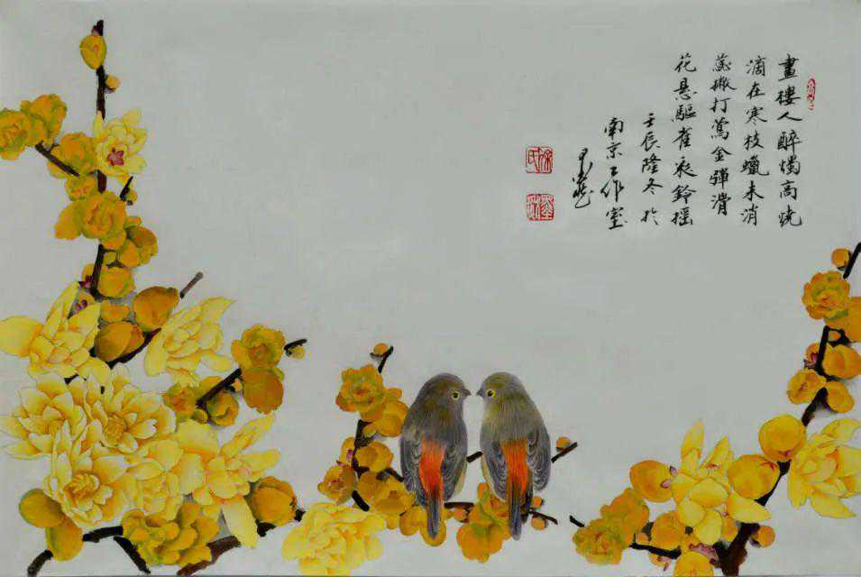 墨然笔下的工笔花鸟传承了他老师喻继高先生的风格,“艳而不俗,淡而不枯”,明快纯情。他从“物境、情境、意境”三个层面“尽其精微”,强调“写实”的工细与物境,“写意”的情境与意趣,“迁想妙得”的意象与意蕴,将表现的“线”、意象的“形”、主观的“情”三者契合,撷取一种贯穿画面的韵律与生机,诗意般地解读、诠释自然、生命和情感。所以他的一幅幅佳作,栩栩如生、生机盎然,灵动、灵性、气势、气韵溢满画面,达到了观画听鸟鸣,“画有尽而意无穷”的艺术境界。
