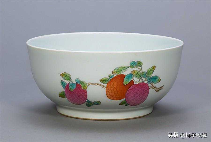 清代嘉庆年间粉彩三多纹墩式碗,广口,深腹,圈足。碗外壁绘有三枝水果,分别是荔枝、石榴和寿桃,此处以三颗饱满的荔枝代替佛手,意在突出“连中三元”的寓意。