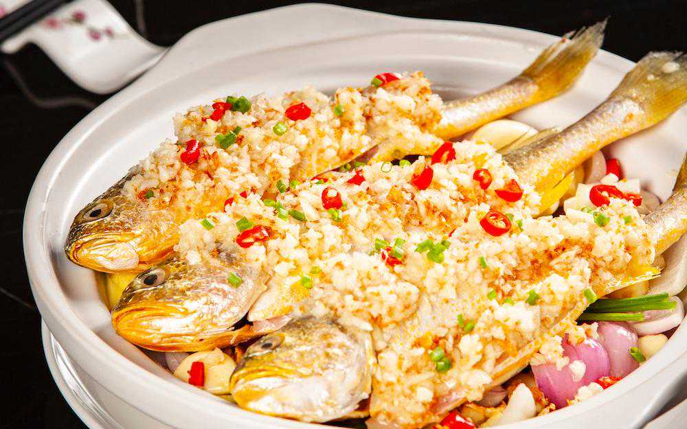 黄金蒜生焗黄花鱼。
