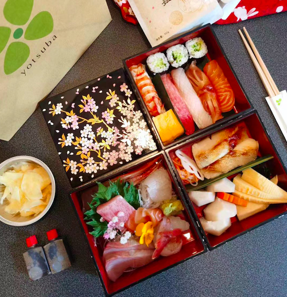 如果想来点浪漫的,在家营造出野餐露营的感觉,不妨试试精致的日式便当。四叶寿司是北京老牌高端日料,旗下丽都店、中关村店、三里屯店和燕莎店近期都推出了限定外卖便当——樱花重箱膳。据介绍,膳箱是日本的一种传统小木箱,多为长方形或者正方形,平时用来放餐具,吃饭时盖子可以当作小饭桌。四叶采用精美的樱花三层膳箱,外层包裹着和风装饰布,十分养眼,吃完后,餐盒还可自留,当成野餐露营的餐具。