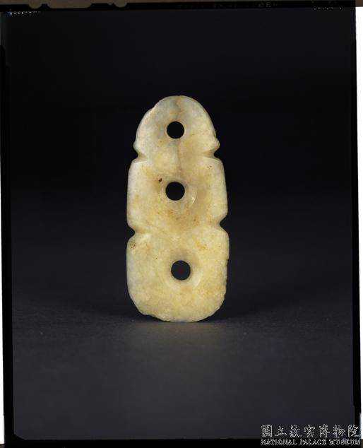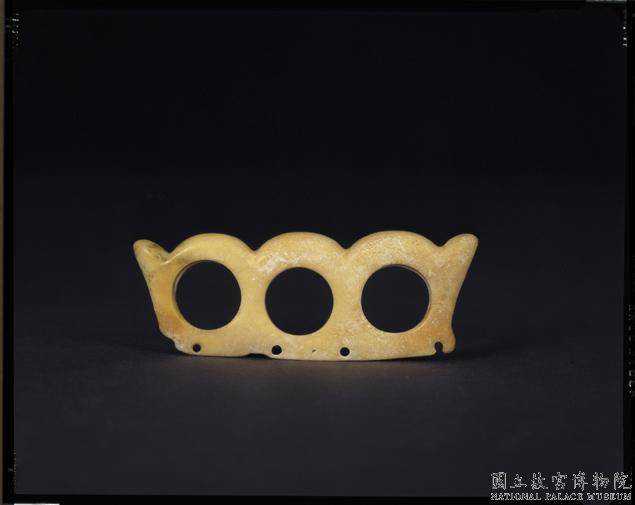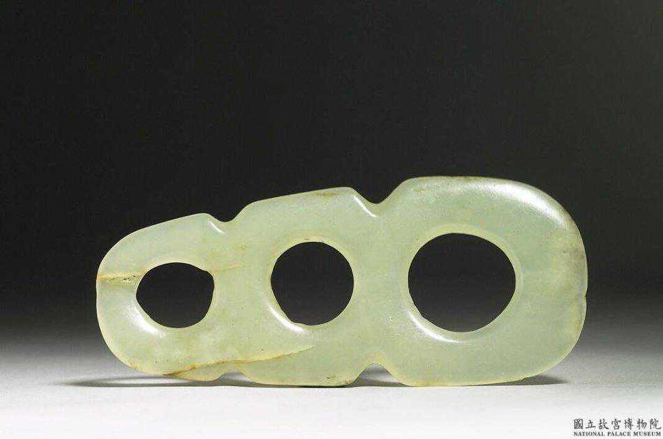 紅山文化晚期三孔器牙白色玉質,一端有黑絲紋斑,半透明。全器為三個環並排,兩側斜突作半葉形,上厚下薄,紅山文化此類器三連環基本相同,兩側所表現的造型常有變化,有作獸首形,有作人首形的,此器作半葉形。最長7.35公分寬2.77公分厚0.76-0.1公分。國立故宮博物院。