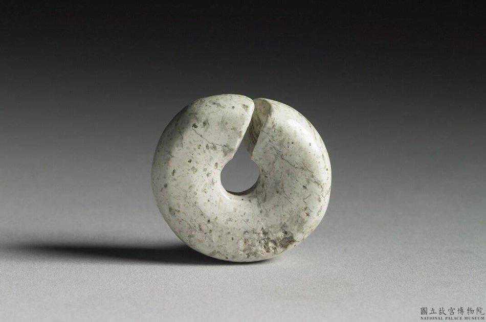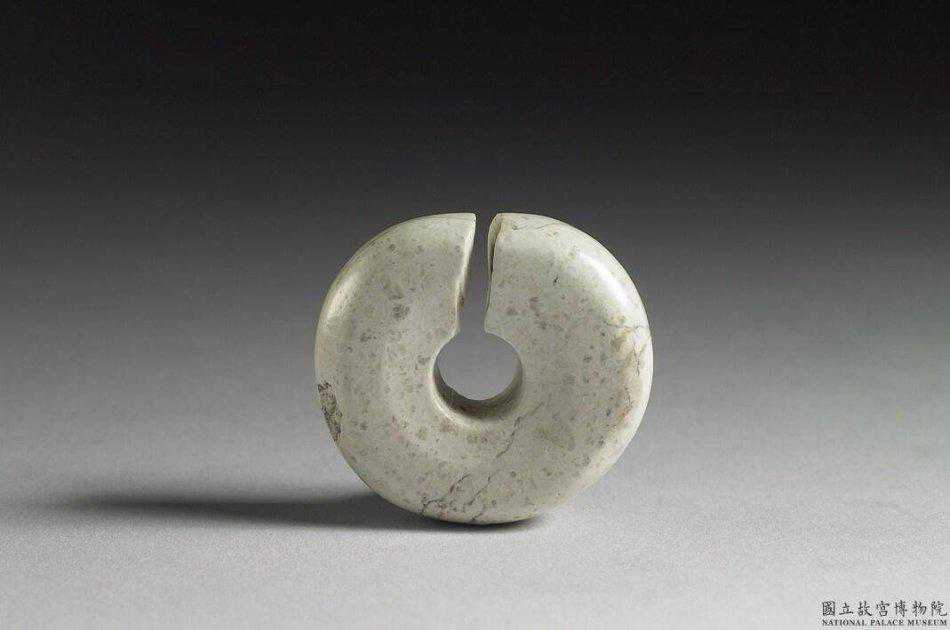 興隆洼文化玉耳飾玦全器沁作白色,有細小的點狀斑。圓環形,有窄長缺口。厚實,中孔周圍器表徵凹陷。外徑3.3-3.55公分孔徑0.94公分厚1.15公分。國立故宮博物院